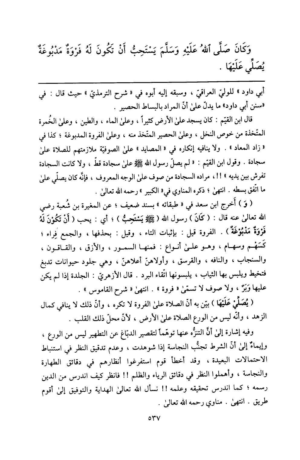 وكان صلّى الله عليه وسلّم يستحبّ أن تكون له فروة مدبوغة يصلّي عليها.