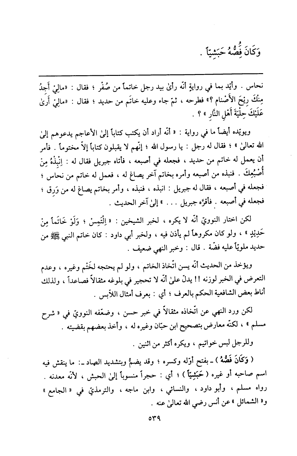(وكان فصّه) - بفتح أوّله وكسره؛ وقد يضمّ وبتشديد الصاد-: ما ينقش فيه اسم صاحبه أو غيره (حبشيّا) ؛ أي: حجرا منسوبا إلى الحبش، لأنّه معدنه.