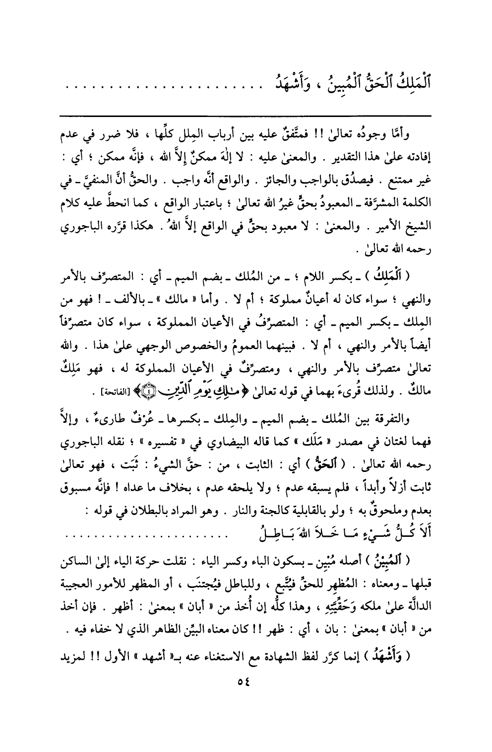 والتفرقة بين الملك- بضم الميم- والملك- بكسرها- عرف طارىء، وإلّا فهما لغتان في مصدر «ملك» كما قاله البيضاوي في «تفسيره» ؛ نقله الباجوري رحمه الله تعالى. (الحقّ) أي: الثابت، من: حقّ الشيء: ثبت، فهو تعالى ثابت أزلا وأبدا، فلم يسبقه عدم؛ ولا يلحقه عدم، بخلاف ما عداه! فإنّه مسبوق بعدم وملحوق به؛ ولو بالقابلية كالجنة والنار. وهو المراد بالبطلان في قوله: