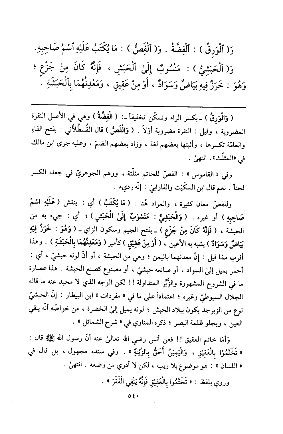 وللفصّ معان كثيرة، والمراد هنا: (ما يكتب) أي: ينقش (عليه اسم صاحبه) أو غيره. (والحبشيّ: منسوب إلى الحبش) ؛ أي: جيء به من الحبشة، (فإنّه كان من جزع) - بفتح الجيم وسكون الزاي- (وهو: خرز فيه بياض وسواد) يشبه به الأعين، (أو من عقيق) كأمير (ومعدنهما بالحبشة) . وهذا أقرب ممّا قيل: إنّ معدنهما باليمن؛ وهي من الحبشة، أو أنّ لونه حبشيّ، أي: