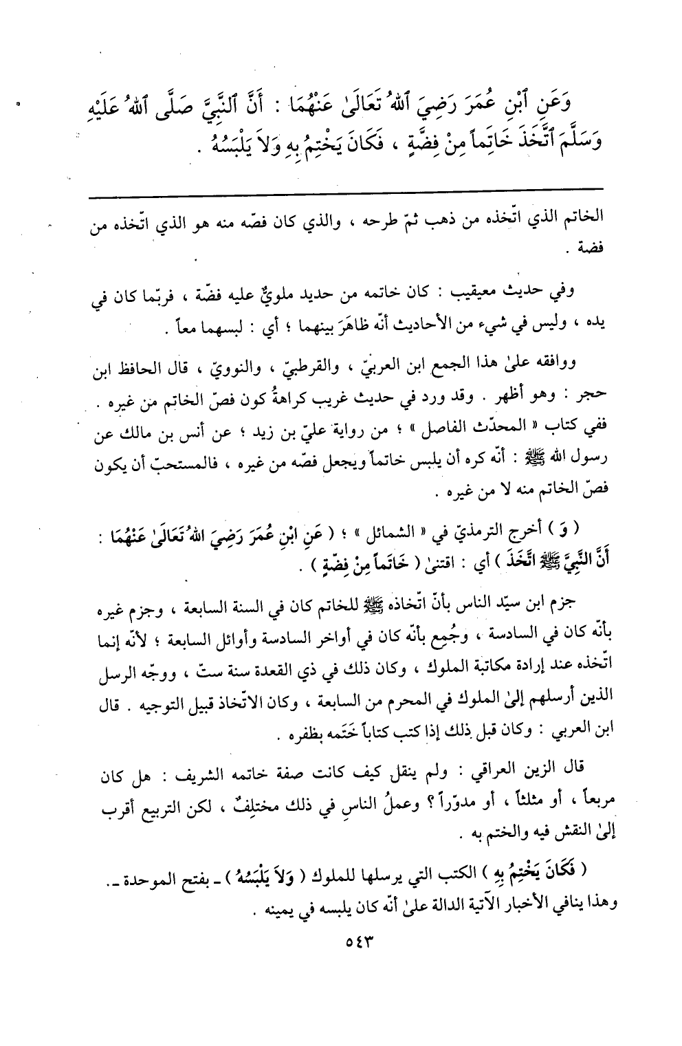 وعن ابن عمر رضي الله تعالى عنهما: أنّ النّبيّ صلّى الله عليه وسلّم اتّخذ خاتما من فضّة، فكان يختم به ولا يلبسه.