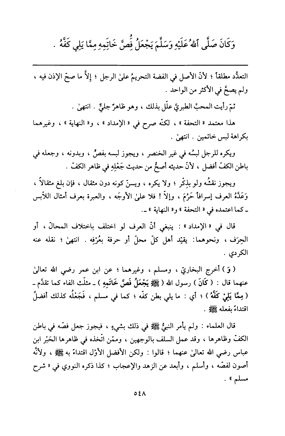 (و) أخرج البخاريّ، ومسلم، وغيرهما؛ عن ابن عمر رضي الله تعالى عنهما قال: (كان) رسول الله (صلّى الله عليه وسلم يجعل فصّ خاتمه) - مثلّث الفاء كما تقدّم- (ممّا يلي كفّه) ؛ أي: ما يلي بطن كفّه؛ كما في مسلم، فجعله كذلك أفضل اقتداء بفعله صلّى الله عليه وسلم.