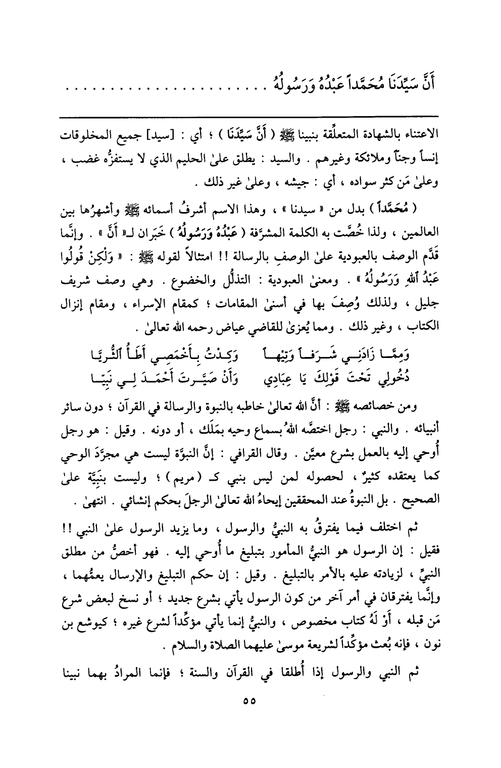 الاعتناء بالشهادة المتعلّقة بنبينا صلّى الله عليه وسلم (أنّ سيّدنا) ؛ أي: [سيد] جميع المخلوقات إنسا وجنّا وملائكة وغيرهم. والسيد: يطلق على الحليم الذي لا يستفزّه غضب، وعلى من كثر سواده، أي: جيشه، وعلى غير ذلك.