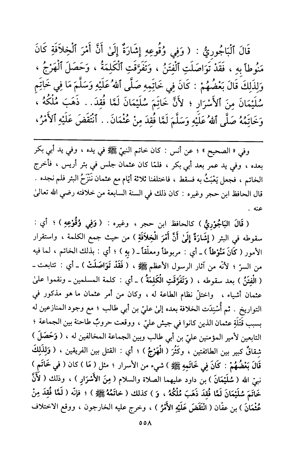 سقوطه في البئر (إشارة إلى أنّ أمر الخلافة) من حيث جمع الكلمة، واستقرار الأمور (كان منوطا) - أي: مربوطا ومعلّقا- (به) ؛ أي: بذلك الخاتم، لما فيه من السرّ؛ لأنّه من آثار الرسول الأعظم صلّى الله عليه وسلم، (فقد تواصلت) - أي: تتابعت- (الفتن) بعد سقوطه، (وتفرّقت الكلمة) - أي: كلمة المسلمين- ونقموا على عثمان أشياء، واختلّ نظام الطاعة له، وكان من أمر عثمان ما هو مذكور في التواريخ. ثم أسندت الخلافة بعده إلى عليّ بن أبي طالب؛ مع وجود المنازعين له بسبب قتلة عثمان الذين كانوا في جيش عليّ، ووقعت حروب طاحنة بين الجماعة؛ التابعين لأمير المؤمنين عليّ بن أبي طالب وبين الجماعة المخالفين له، (وحصل) شقاق كبير بين الطائفتين، وكثر (الهرج) ؛ أي: القتل بين الفريقين، (ولذلك قال بعضهم: كان في خاتمه صلّى الله عليه وسلم) شيء من الأسرار؛ مثل (ما) كان (في خاتم) نبيّ الله (سليمان) بن داود عليهما الصلاة والسلام (من الأسرار) ، وذلك (لأنّ خاتم سليمان لمّا فقد ذهب ملكه، و) كذلك (خاتمه صلّى الله عليه وسلم) ؛ فإنّه (لمّا فقد من عثمان) بن عفّان (انتقض عليه الأمر) ، وخرج عليه الخارجون، ووقع الاختلاف