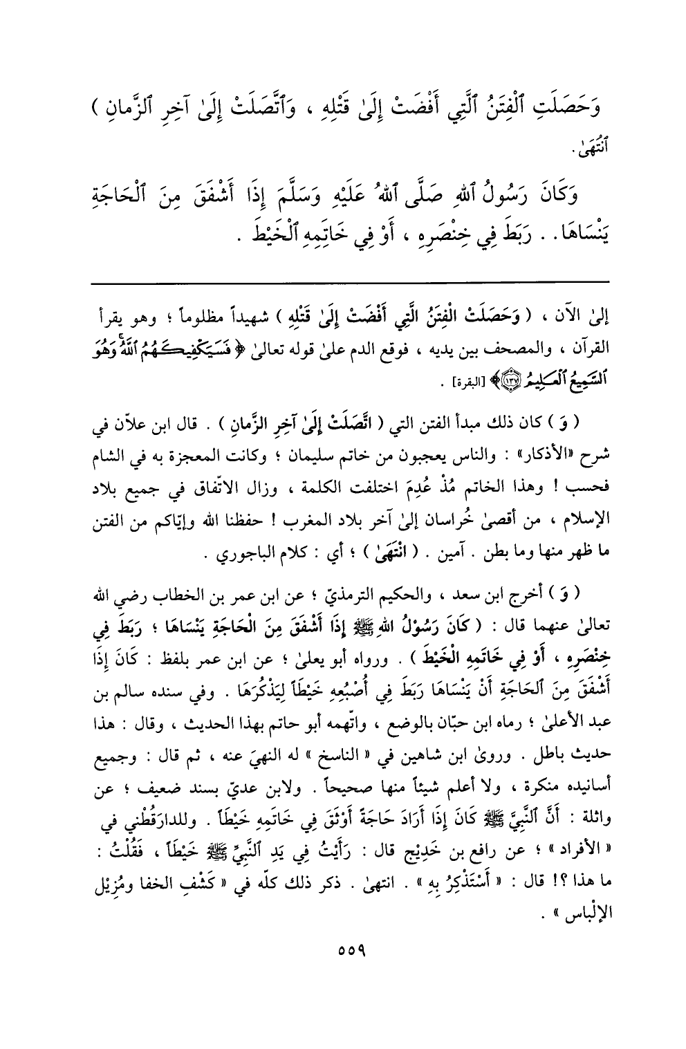 (و) كان ذلك مبدأ الفتن التي (اتّصلت إلى آخر الزّمان) . قال ابن علّان في شرح «الأذكار» : والناس يعجبون من خاتم سليمان؛ وكانت المعجزة به في الشام فحسب! وهذا الخاتم مذ عدم اختلفت الكلمة، وزال الاتّفاق في جميع بلاد الإسلام، من أقصى خراسان إلى آخر بلاد المغرب! حفظنا الله وإيّاكم من الفتن ما ظهر منها وما بطن. آمين. (انتهى) ؛ أي: كلام الباجوري.