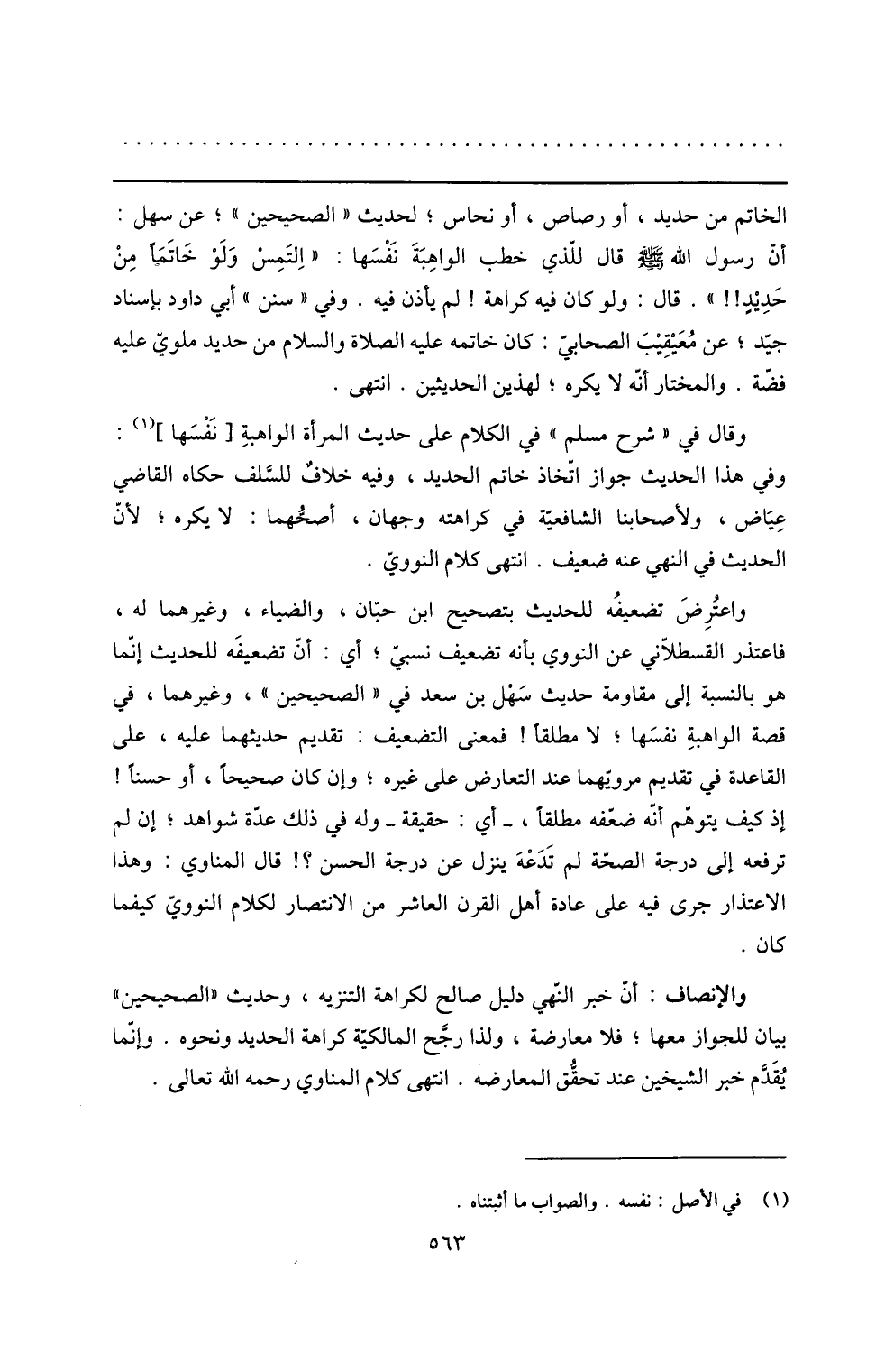 واعترض تضعيفه للحديث بتصحيح ابن حبّان، والضياء، وغيرهما له، فاعتذر القسطلّاني عن النووي بأنه تضعيف نسبيّ؛ أي: أنّ تضعيفه للحديث إنّما هو بالنسبة إلى مقاومة حديث سهل بن سعد في «الصحيحين» ، وغيرهما، في قصة الواهبة نفسها؛ لا مطلقا! فمعنى التضعيف: تقديم حديثهما عليه، على القاعدة في تقديم مرويّهما عند التعارض على غيره؛ وإن كان صحيحا، أو حسنا! إذ كيف يتوهّم أنّه ضعّفه مطلقا، - أي: حقيقة- وله في ذلك عدّة شواهد؛ إن لم ترفعه إلى درجة الصحّة لم تدعه ينزل عن درجة الحسن؟! قال المناوي: وهذا الاعتذار جرى فيه على عادة أهل القرن العاشر من الانتصار لكلام النوويّ كيفما كان.
