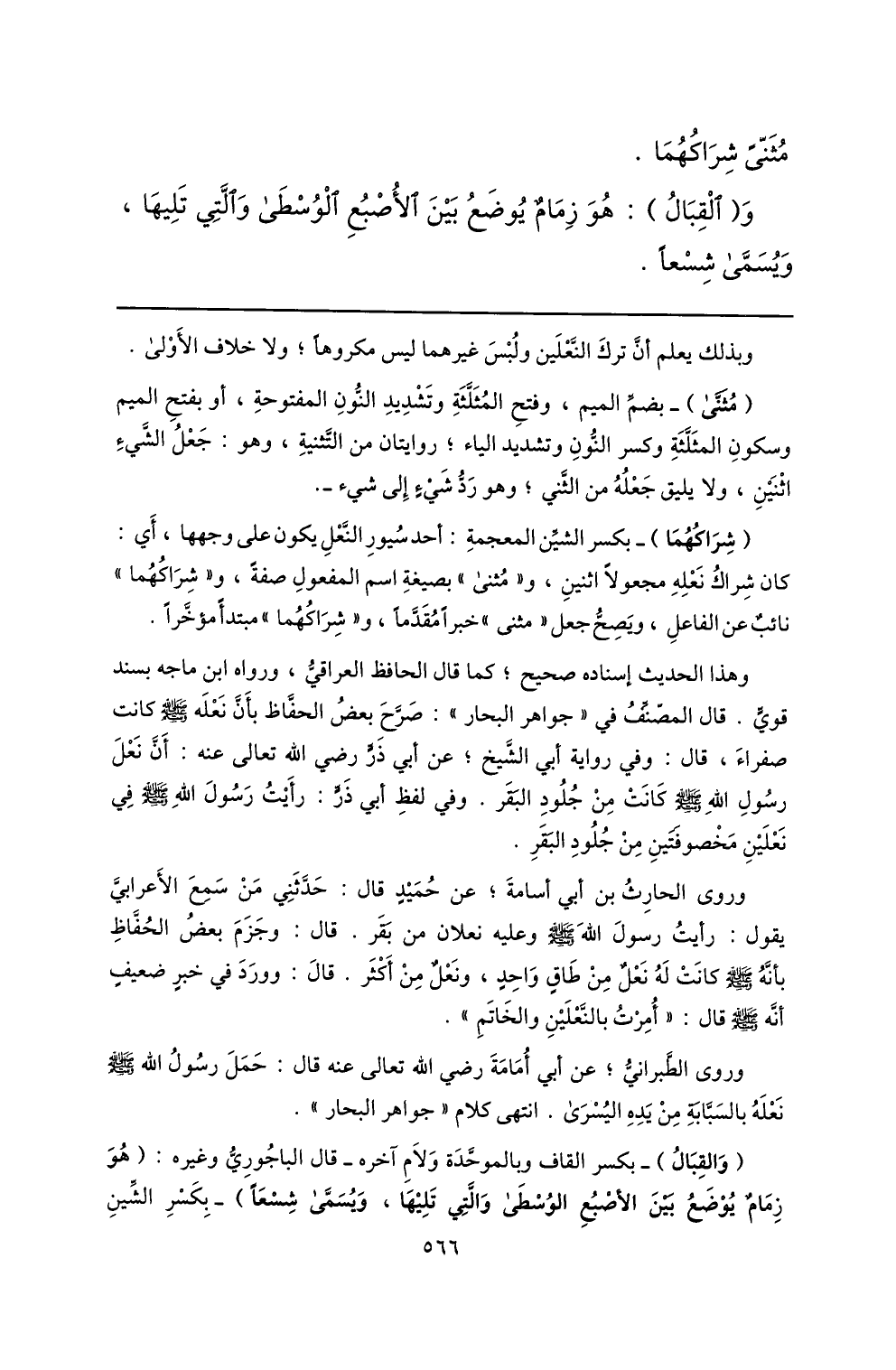 وروى الطّبرانيّ؛ عن أبي أمامة رضي الله تعالى عنه قال: حمل رسول الله صلّى الله عليه وسلم نعله بالسبّابة من يده اليسرى. انتهى كلام «جواهر البحار» .
