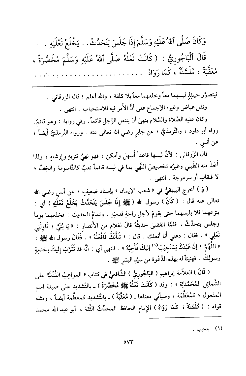 (قال) العلّامة إبراهيم (الباجوريّ) الشّافعيّ في كتاب «المواهب اللّدنّيّة على الشّمائل المحمّديّة» : وقد (كانت نعله صلّى الله عليه وسلم مخصّرة) - بالتّشديد على صيغة اسم المفعول؛ كمعظّمة، وسيأتي معناها- (معقّبة) - بالتّشديد كمعظّمة أيضا، ومثله قوله: (ملسّنة؛ كما رواه) الإمام الحافظ المحدّث الثّقة، أبو عبد الله محمد