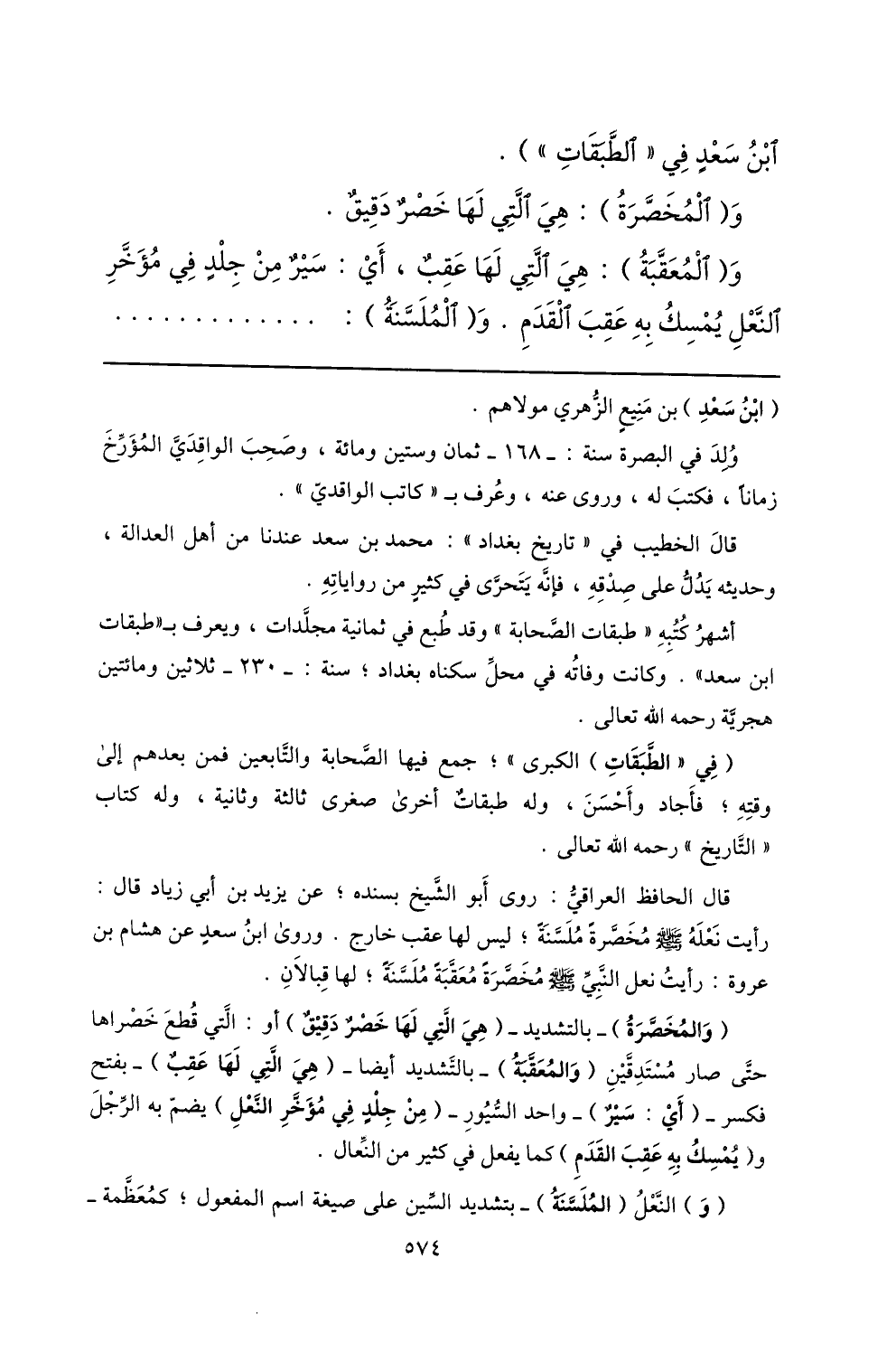 و (المعقّبة) : هي الّتي لها عقب، أي: سير من جلد في مؤخّر النّعل يمسك به عقب القدم. و (الملسّنة) : ...