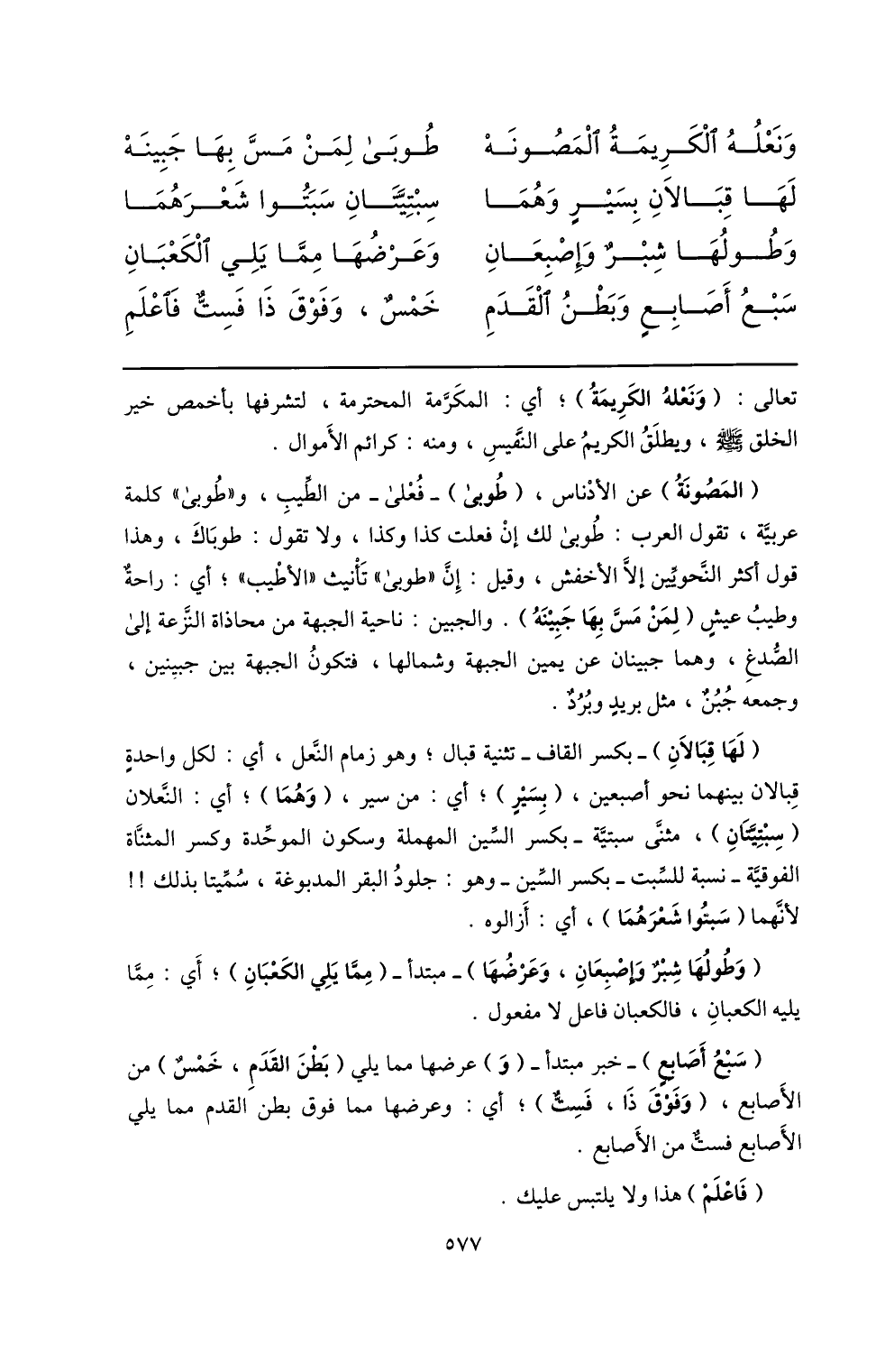 (المصونة) عن الأدناس، (طوبى) - فعلى- من الطّيب، و «طوبى» كلمة عربيّة، تقول العرب: طوبى لك إن فعلت كذا وكذا، ولا تقول: طوباك، وهذا قول أكثر النّحويّين إلّا الأخفش، وقيل: إنّ «طوبى» تأنيث «الأطيب» ؛ أي: راحة وطيب عيش (لمن مسّ بها جبينه) . والجبين: ناحية الجبهة من محاذاة النّزعة إلى الصّدغ، وهما جبينان عن يمين الجبهة وشمالها، فتكون الجبهة بين جبينين، وجمعه جبن، مثل بريد وبرد.