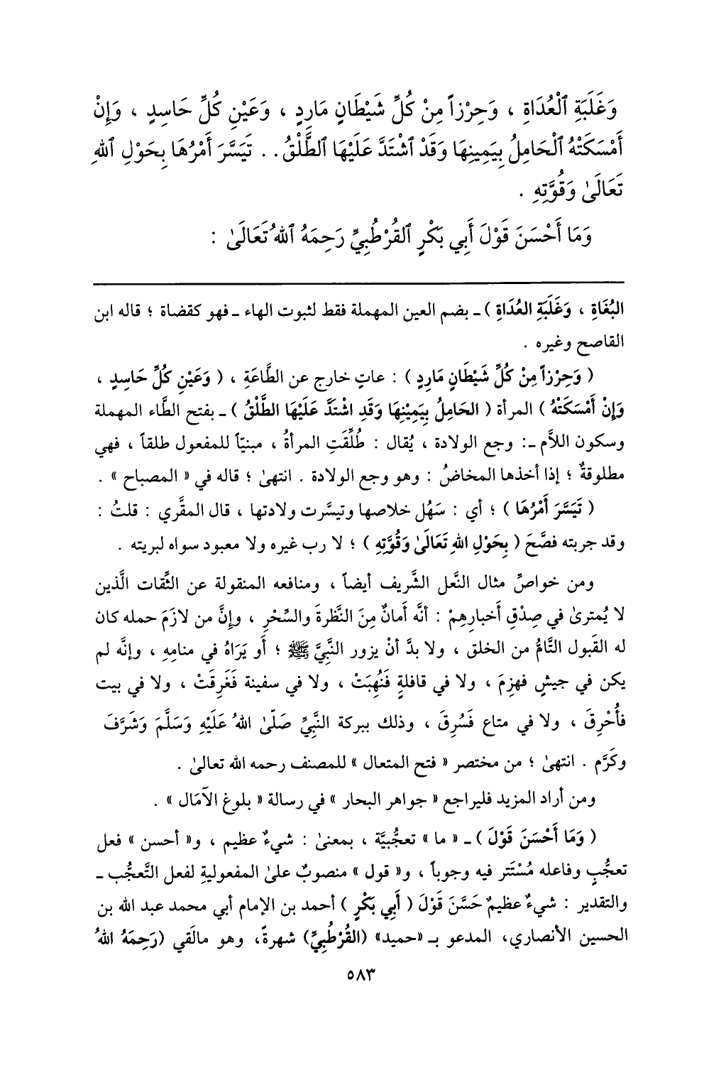 وغلبة العداة، وحرزا من كلّ شيطان مارد، وعين كلّ حاسد، وإن أمسكته الحامل بيمينها وقد اشتدّ عليها الطّلق.. تيسّر أمرها بحول الله تعالى وقوّته.