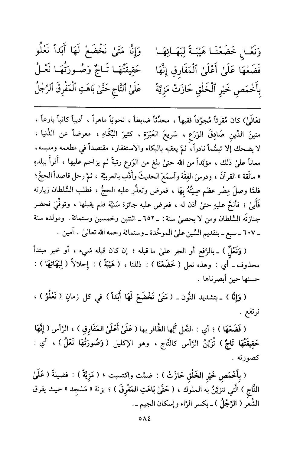(ونعل) - بالرّفع أو الجر على ما قبله؛ إن كان قبله شيء، أو خبر مبتدأ محذوف- أي: وهذه نعل (خضعنا) : ذللنا، (هيبة) : إجلالا (لبهائها) :