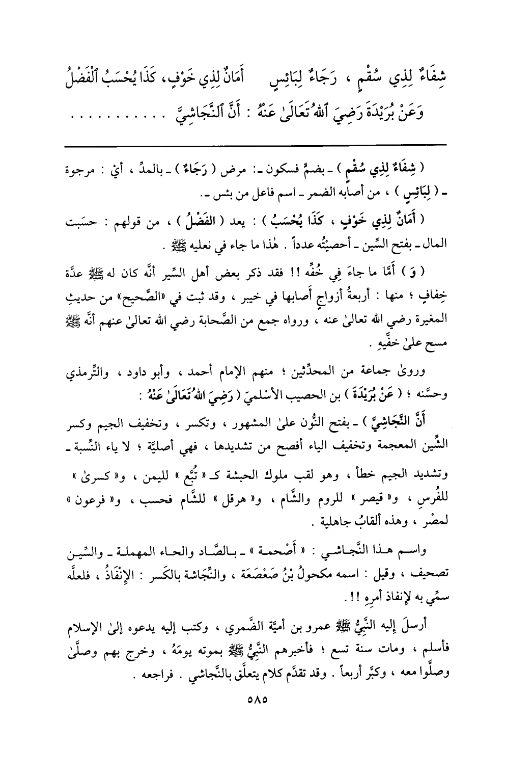 أنّ النّجاشيّ) - بفتح النّون على المشهور، وتكسر، وتخفيف الجيم وكسر الشّين المعجمة وتخفيف الياء أفصح من تشديدها، فهي أصليّة؛ لا ياء النّسبة- وتشديد الجيم خطأ، وهو لقب ملوك الحبشة ك «تبّع» لليمن، و «كسرى» للفرس، و «قيصر» للروم والشّام، و «هرقل» للشّام فحسب، و «فرعون» لمصر، وهذه ألقاب جاهلية.