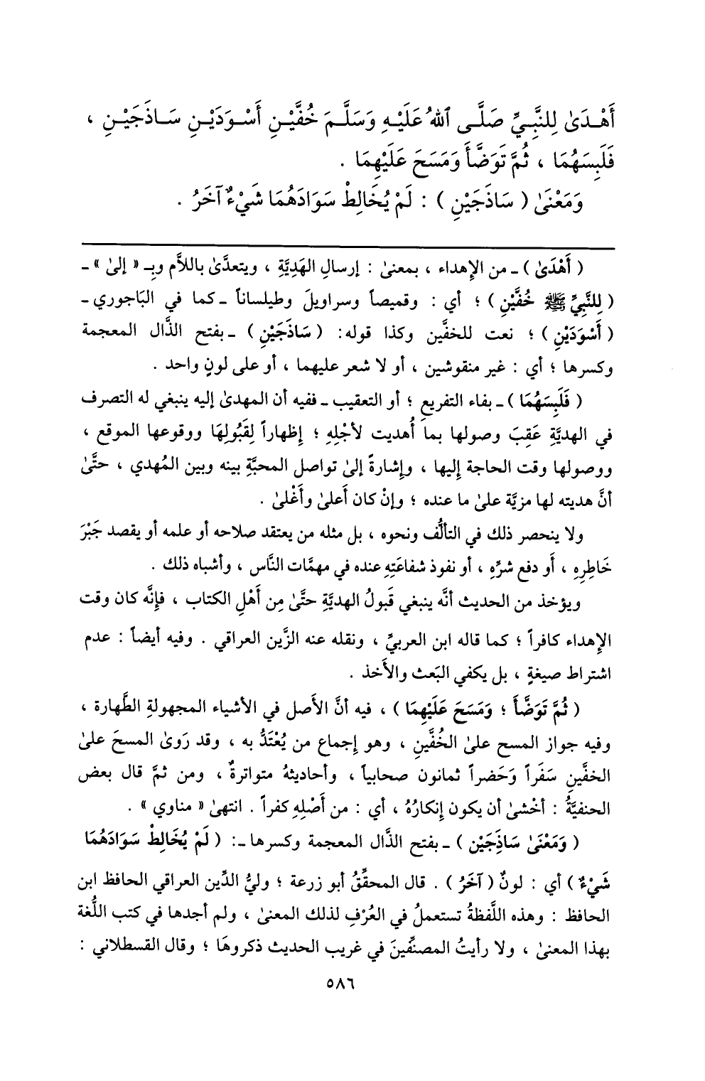 (أهدى) - من الإهداء، بمعنى: إرسال الهديّة، ويتعدّى باللّام وب «إلى» - (للنّبيّ صلّى الله عليه وسلم خفّين) ؛ أي: وقميصا وسراويل وطيلسانا- كما في الباجوري- (أسودين) ؛ نعت للخفّين وكذا قوله: (ساذجين) - بفتح الذّال المعجمة وكسرها؛ أي: غير منقوشين، أو لا شعر عليهما، أو على لون واحد.