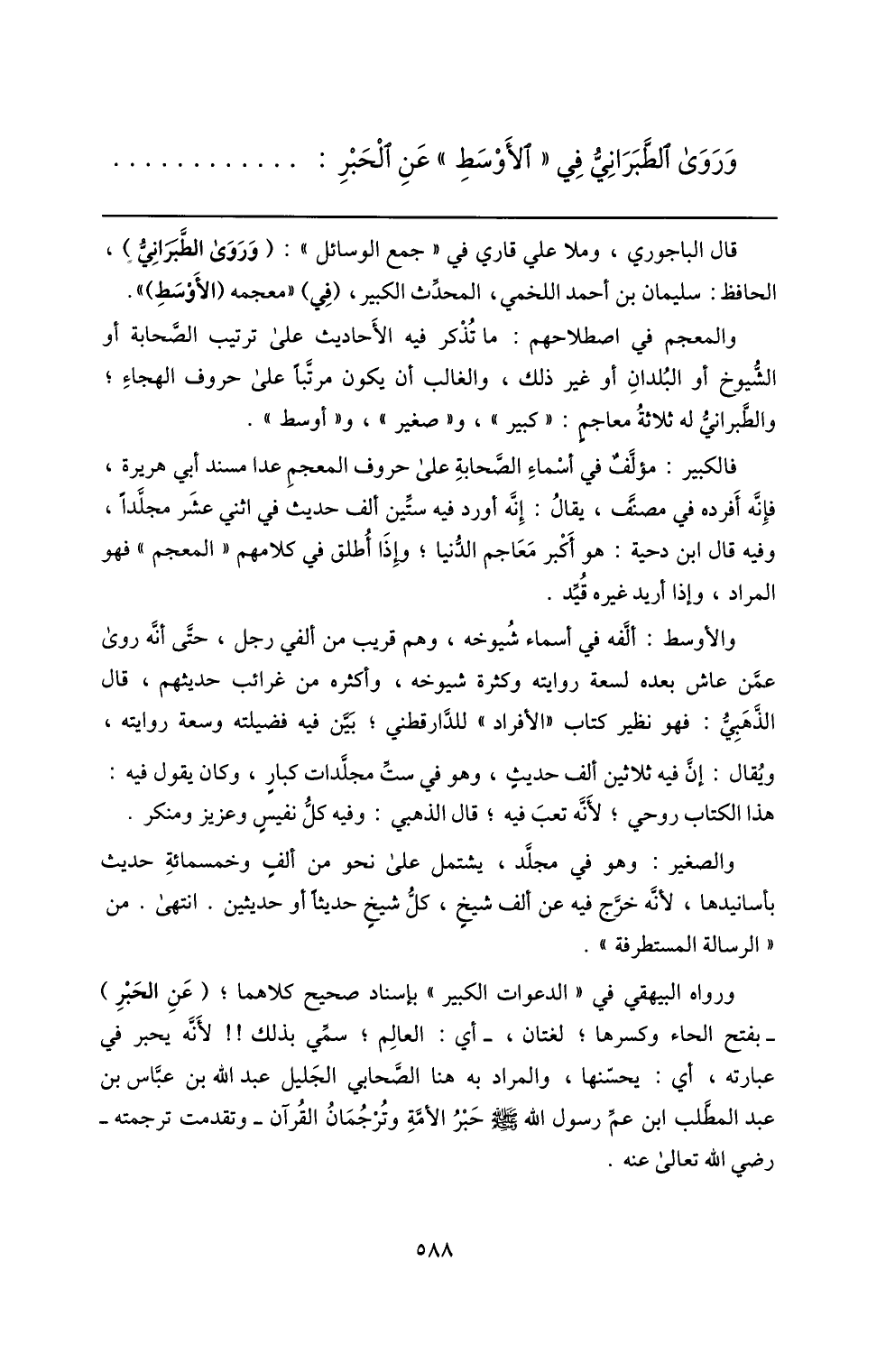 قال الباجوري، وملا علي قاري في «جمع الوسائل» : (وروى الطّبرانيّ) ، الحافظ: سليمان بن أحمد اللخمي، المحدّث الكبير، (في) «معجمه (الأوسط) » .