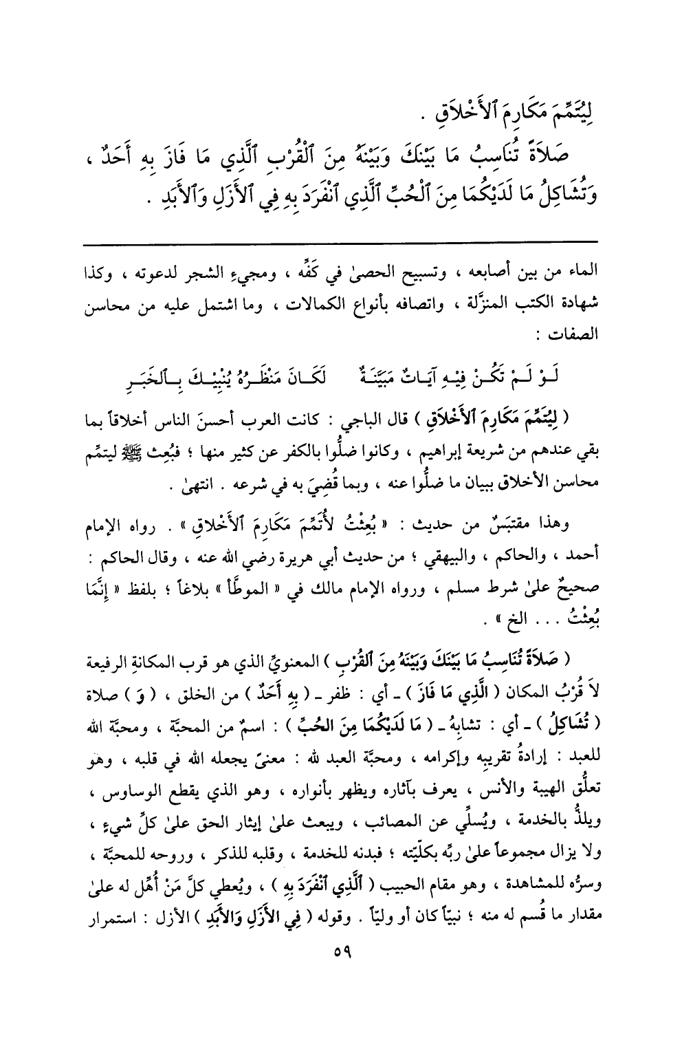 (صلاة تناسب ما بينك وبينه من القرب) المعنويّ الذي هو قرب المكانة الرفيعة لا قرب المكان (الّذي ما فاز) - أي: ظفر- (به أحد) من الخلق، (و) صلاة (تشاكل) - أي: تشابه- (ما لديكما من الحبّ) : اسم من المحبّة، ومحبّة الله للعبد: إرادة تقريبه وإكرامه، ومحبّة العبد لله: معنى يجعله الله في قلبه، وهو تعلّق الهيبة والأنس، يعرف بآثاره ويظهر بأنواره، وهو الذي يقطع الوساوس، ويلذّ بالخدمة، ويسلّي عن المصائب، ويبعث على إيثار الحق على كلّ شيء، ولا يزال مجموعا على ربّه بكلّيّته؛ فبدنه للخدمة، وقلبه للذكر، وروحه للمحبّة، وسرّه للمشاهدة، وهو مقام الحبيب (الّذي انفرد به) ، ويعطي كلّ من أهّل له على مقدار ما قسم له منه؛ نبيّا كان أو وليّا. وقوله (في الأزل والأبد) الأزل: استمرار