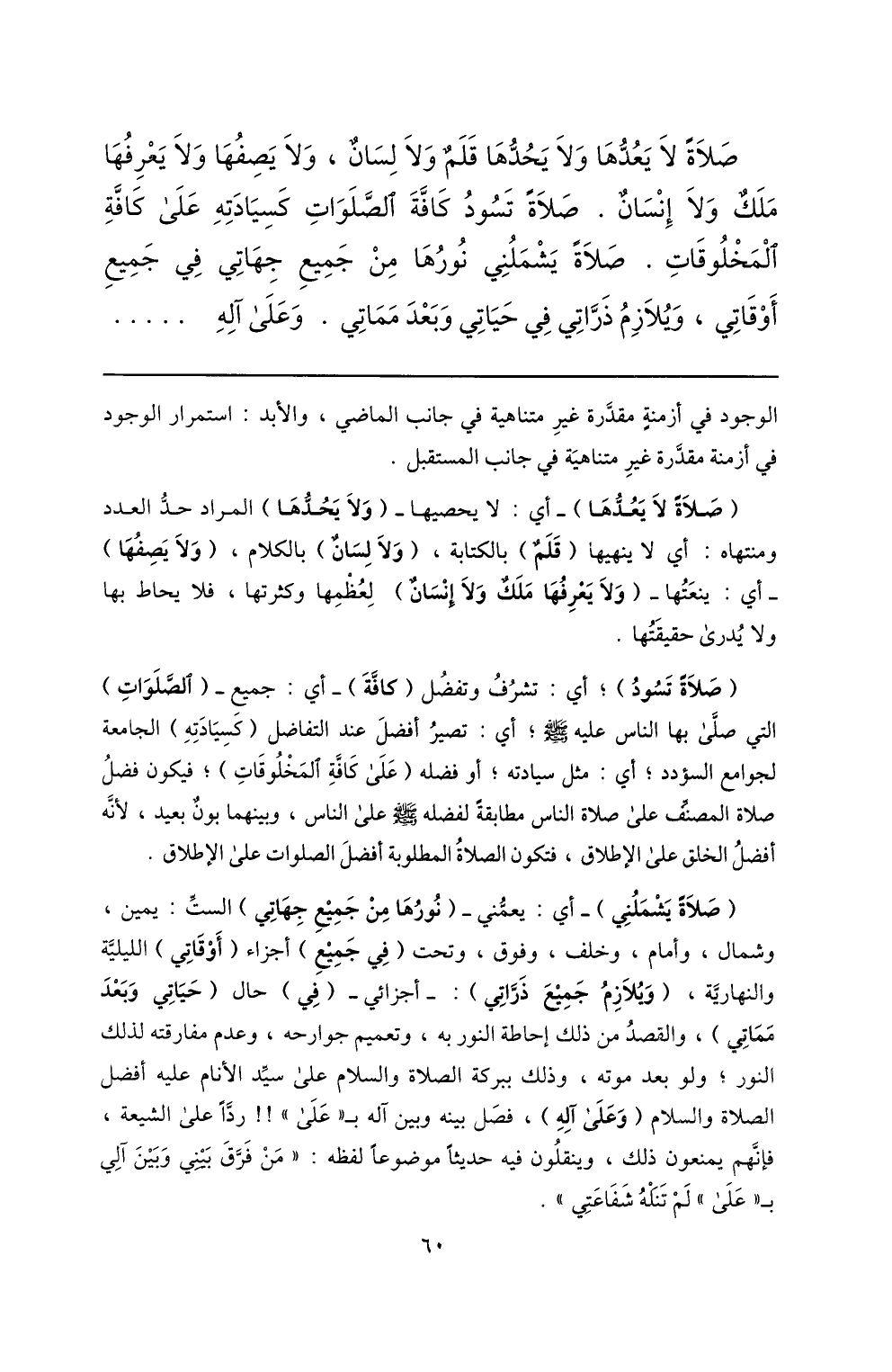 صلاة لا يعدّها ولا يحدّها قلم ولا لسان، ولا يصفها ولا يعرفها ملك ولا إنسان. صلاة تسود كافّة الصّلوات كسيادته على كافّة المخلوقات. صلاة يشملني نورها من جميع جهاتي في جميع أوقاتي، ويلازم ذرّاتي في حياتي وبعد مماتي. وعلى آله ...