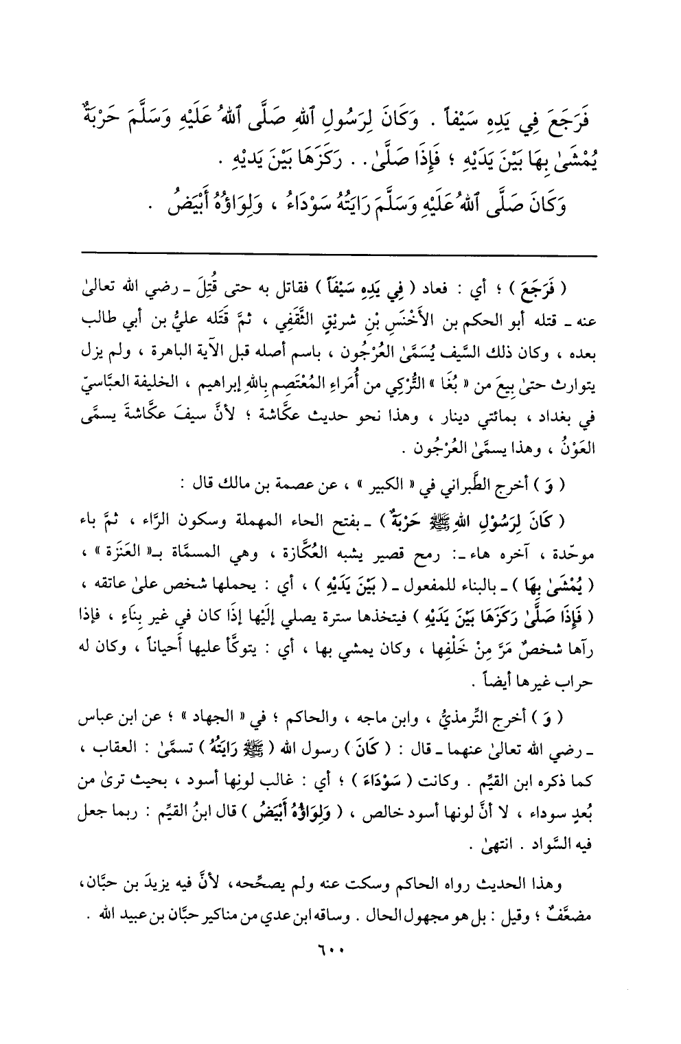 فرجع في يده سيفا. وكان لرسول الله صلّى الله عليه وسلّم حربة يمشى بها بين يديه؛ فإذا صلّى.. ركزها بين يديه.