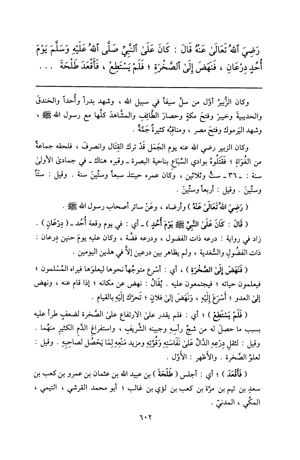 رضي الله تعالى عنه قال: كان على النّبيّ صلّى الله عليه وسلّم يوم أحد درعان، فنهض إلى الصّخرة؛ فلم يستطع، فأقعد طلحة ...