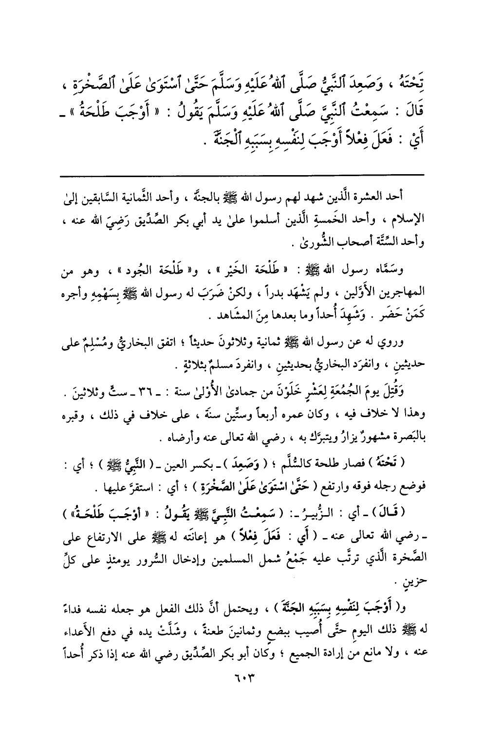 تحته، وصعد النّبيّ صلّى الله عليه وسلّم حتّى استوى على الصّخرة، قال: سمعت النّبيّ صلّى الله عليه وسلّم يقول: «أوجب طلحة» - أي: فعل فعلا أوجب لنفسه بسببه الجنّة.
