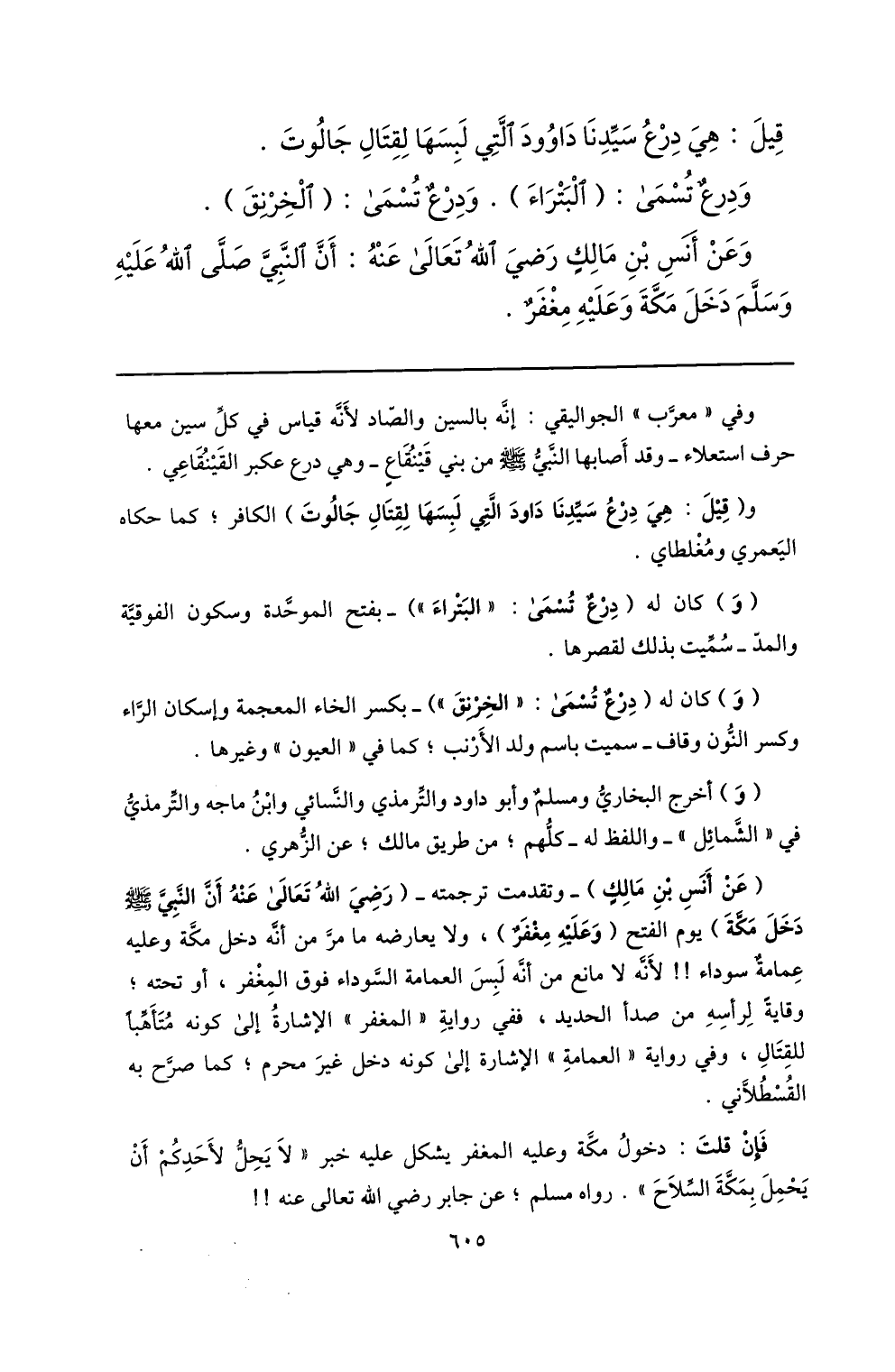 وعن أنس بن مالك رضي الله تعالى عنه: أنّ النّبيّ صلّى الله عليه وسلّم دخل مكّة وعليه مغفر.