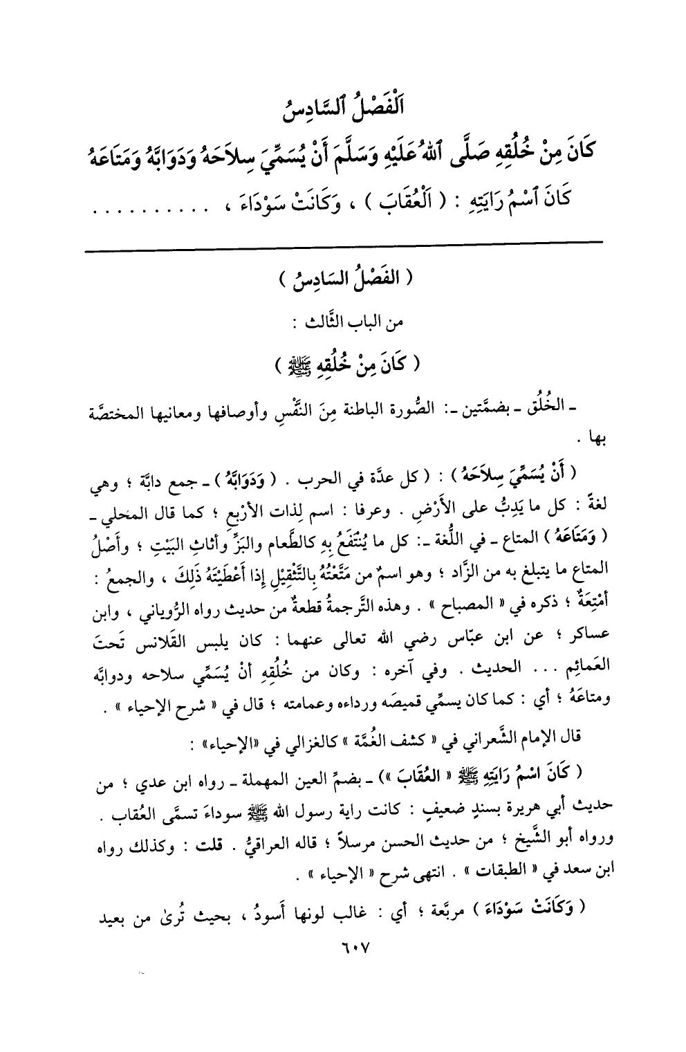الفصل السّادس كان من خلقه صلّى الله عليه وسلّم أن يسمّي سلاحه ودوابّه ومتاعه كان اسم رايته: (العقاب) ، وكانت سوداء، ...