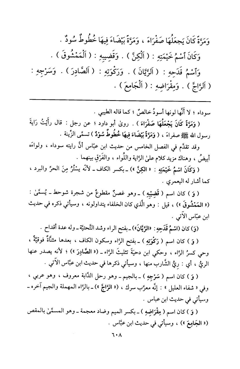 (ومرّة كان يجعلها صفراء) . روى أبو داود؛ عن رجل: قال رأيت راية رسول الله صلّى الله عليه وسلم صفراء، (ومرّة بيضاء فيها خطوط سود) تسمّى الزّينة.
