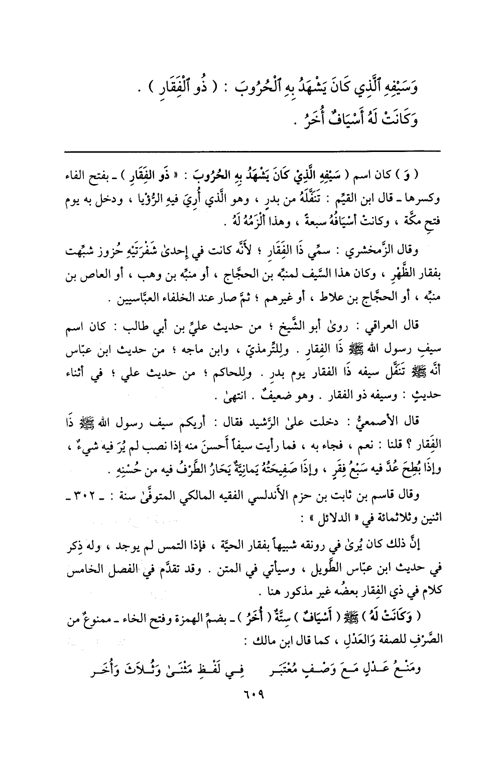 قال العراقي: روى أبو الشّيخ؛ من حديث عليّ بن أبي طالب: كان اسم سيف رسول الله صلّى الله عليه وسلم ذا الفقار. وللتّرمذيّ، وابن ماجه؛ من حديث ابن عبّاس أنّه صلّى الله عليه وسلم تنفّل سيفه ذا الفقار يوم بدر. وللحاكم؛ من حديث علي؛ في أثناء حديث: وسيفه ذو الفقار. وهو ضعيف. انتهى.