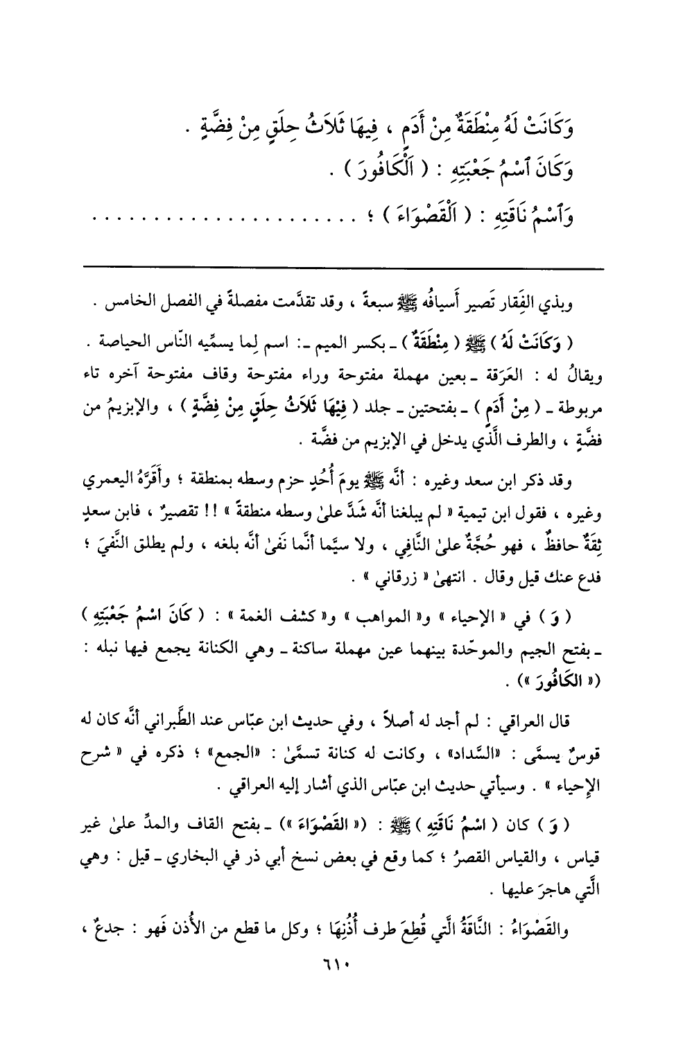 وقد ذكر ابن سعد وغيره: أنّه صلّى الله عليه وسلم يوم أحد حزم وسطه بمنطقة؛ وأقرّه اليعمري وغيره، فقول ابن تيمية «لم يبلغنا أنّه شدّ على وسطه منطقة» !! تقصير، فابن سعد ثقة حافظ، فهو حجّة على النّافي، ولا سيّما أنّما نفى أنّه بلغه، ولم يطلق النّفي؛ فدع عنك قيل وقال. انتهى «زرقاني» .