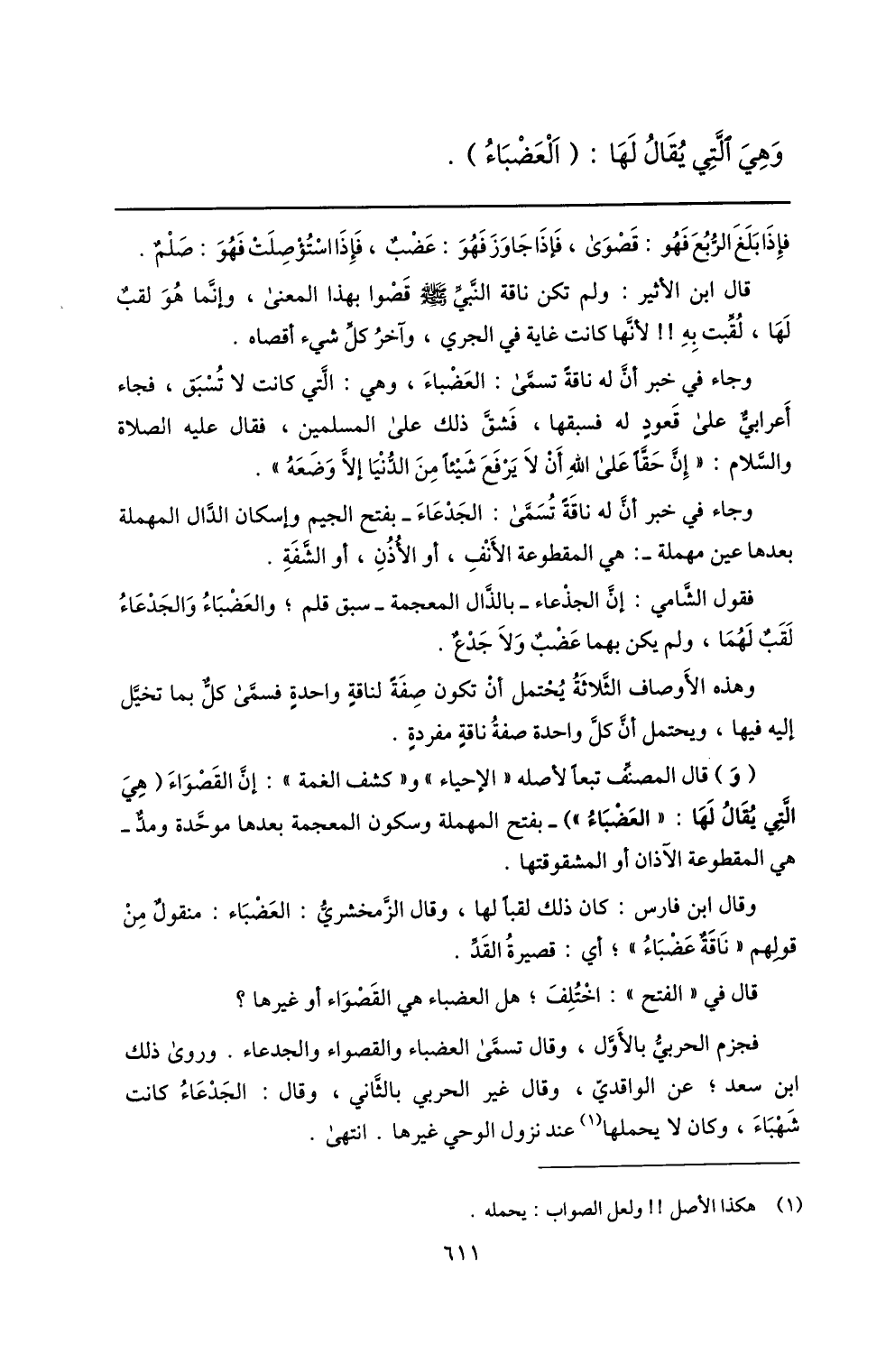 (و) قال المصنّف تبعا لأصله «الإحياء» و «كشف الغمة» : إنّ القصواء (هي الّتي يقال لها: «العضباء» ) - بفتح المهملة وسكون المعجمة بعدها موحّدة ومدّ- هي المقطوعة الآذان أو المشقوقتها.