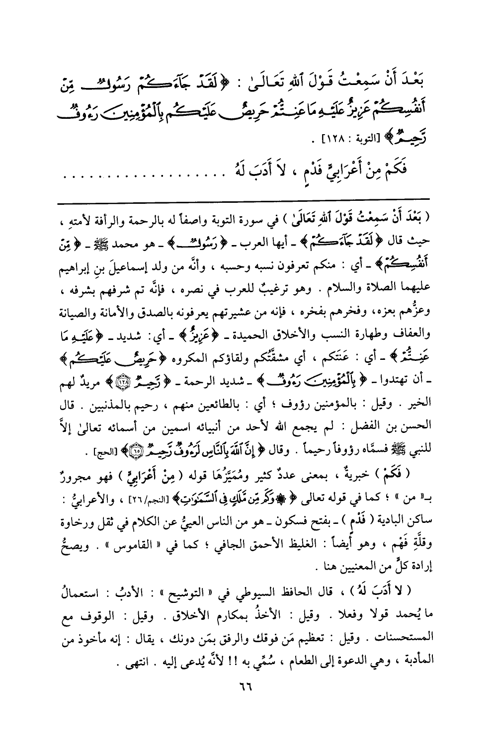 (بعد أن سمعت قول الله تعالى) في سورة التوبة واصفا له بالرحمة والرأفة لأمته، حيث قال (لَقَدْ جاءَكُمْ) - أيها العرب- (رَسُولٌ) - هو محمد صلّى الله عليه وسلم- (مِنْ أَنْفُسِكُمْ) - أي: منكم تعرفون نسبه وحسبه، وأنّه من ولد إسماعيل بن إبراهيم عليهما الصلاة والسلام. وهو ترغيب للعرب في نصره، فإنّه تم شرفهم بشرفه، وعزّهم بعزه، وفخرهم بفخره، فإنه من عشيرتهم يعرفونه بالصدق والأمانة والصيانة والعفاف وطهارة النسب والأخلاق الحميدة- (عَزِيزٌ) - أي: شديد- (عَلَيْهِ ما عَنِتُّمْ) - أي: عنتكم، أي مشقّتكم ولقاؤكم المكروه (حَرِيصٌ عَلَيْكُمْ) أن تهتدوا- (بِالْمُؤْمِنِينَ رَؤُفٌ) - شديد الرحمة- (رَحِيمٌ) (128) مريد لهم الخير. وقيل: بالمؤمنين رؤوف؛ أي: بالطائعين منهم، رحيم بالمذنبين. قال الحسن بن الفضل: لم يجمع الله لأحد من أنبيائه اسمين من أسمائه تعالى إلّا للنبي صلّى الله عليه وسلم فسمّاه رؤوفا رحيما. وقال (إِنَّ اللَّهَ بِالنَّاسِ لَرَؤُفٌ رَحِيمٌ) (65) [الحج] .
