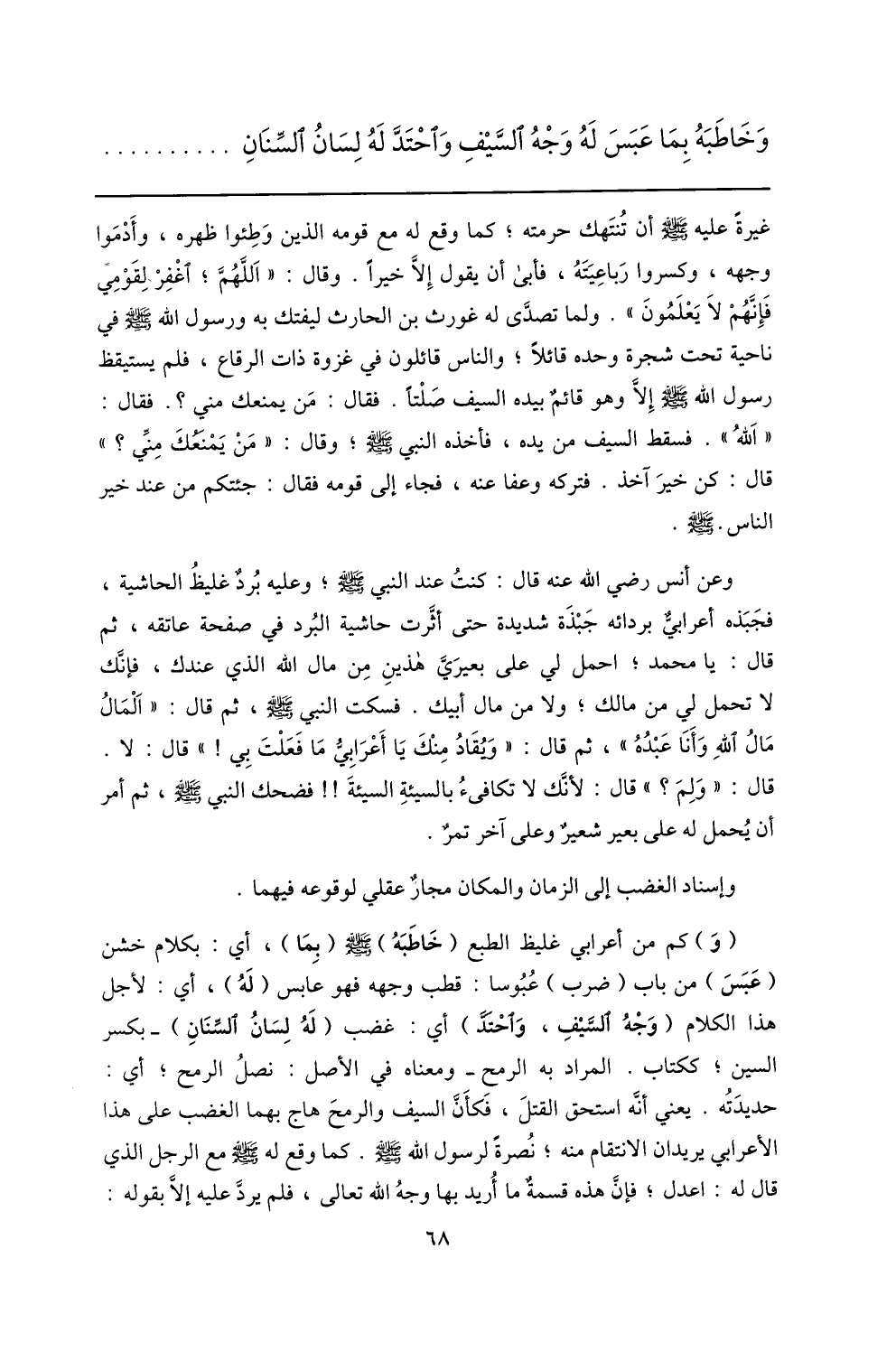 (و) كم من أعرابي غليظ الطبع (خاطبه) صلّى الله عليه وسلم (بما) ، أي: بكلام خشن (عبس) من باب (ضرب) عبوسا: قطب وجهه فهو عابس (له) ، أي: لأجل هذا الكلام (وجه السّيف، واحتدّ) أي: غضب (له لسان السّنان) - بكسر السين؛ ككتاب. المراد به الرمح- ومعناه في الأصل: نصل الرمح؛ أي: