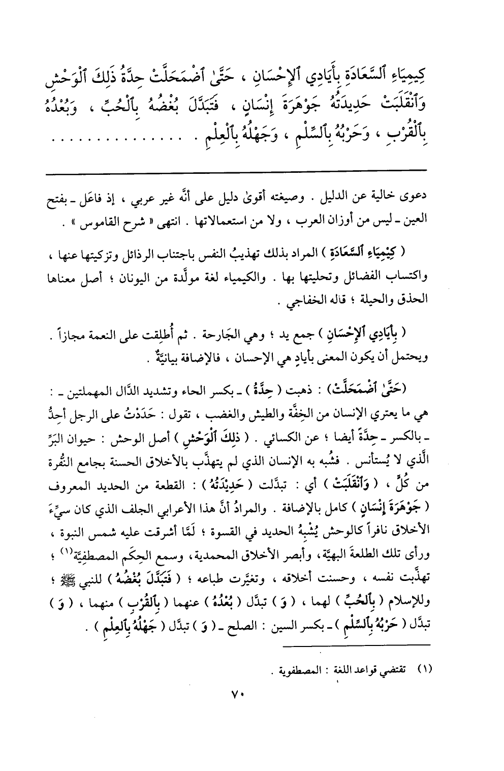 (كيمياء السّعادة) المراد بذلك تهذيب النفس باجتناب الرذائل وتزكيتها عنها، واكتساب الفضائل وتحليتها بها. والكيمياء لغة مولّدة من اليونان؛ أصل معناها الحذق والحيلة؛ قاله الخفاجي.
