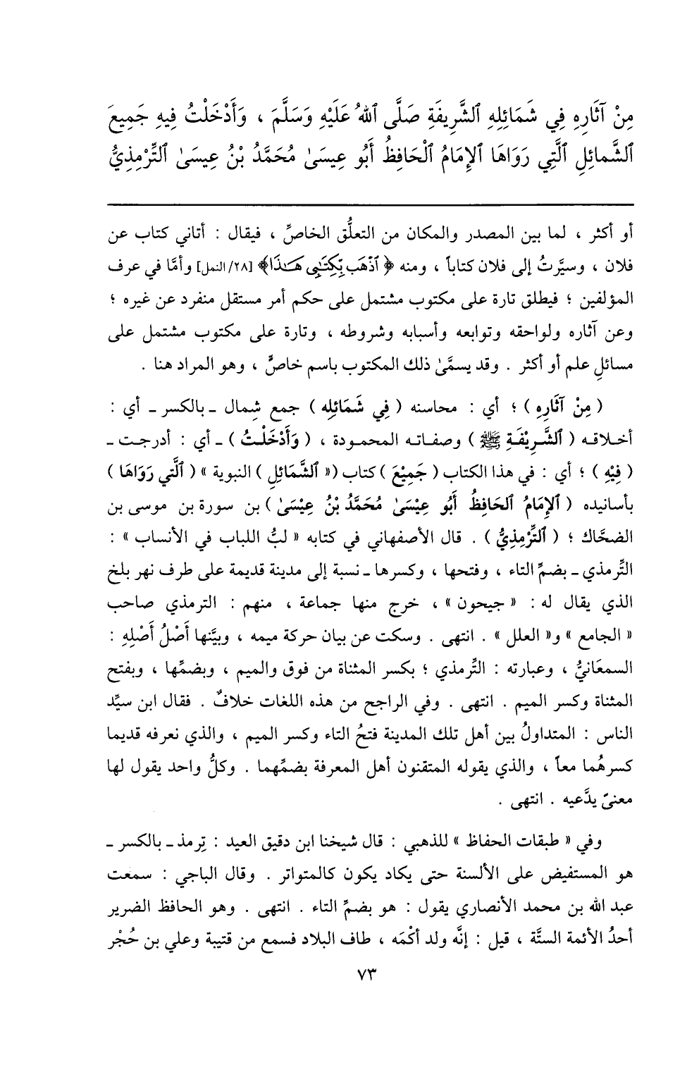 أخلاقه (الشّريفة صلّى الله عليه وسلم) وصفاته المحمودة، (وأدخلت) - أي: أدرجت- (فيه) ؛ أي: في هذا الكتاب (جميع) كتاب ( «الشمائل) النبوية» (الّتي رواها) بأسانيده (الإمام الحافظ أبو عيسى محمّد بن عيسى) بن سورة بن موسى بن الضحّاك؛ (التّرمذيّ) . قال الأصفهاني في كتابه «لبّ اللباب في الأنساب» :