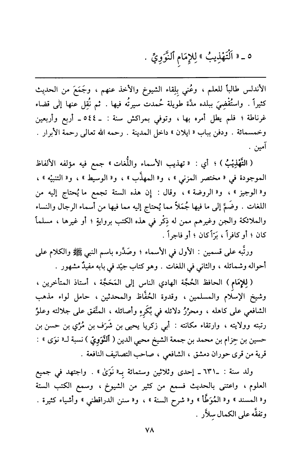(التّهذيب) ؛ أي: «تهذيب الأسماء واللّغات» جمع فيه مؤلفه الألفاظ الموجودة في «مختصر المزني» ، و «المهذّب» ، و «الوسيط» ، و «التنبيه» ، و «الوجيز» ، و «الروضة» ، وقال: إن هذه الستة تجمع ما يحتاج إليه من اللغات. وضمّ إلى ما فيها جملا مما يحتاج إليه مما فيها من أسماء الرجال والنساء والملائكة والجن وغيرهم ممن له ذكر في هذه الكتب برواية؛ أو غيرها، مسلما كان؛ أو كافرا، برّا كان؛ أو فاجرا.