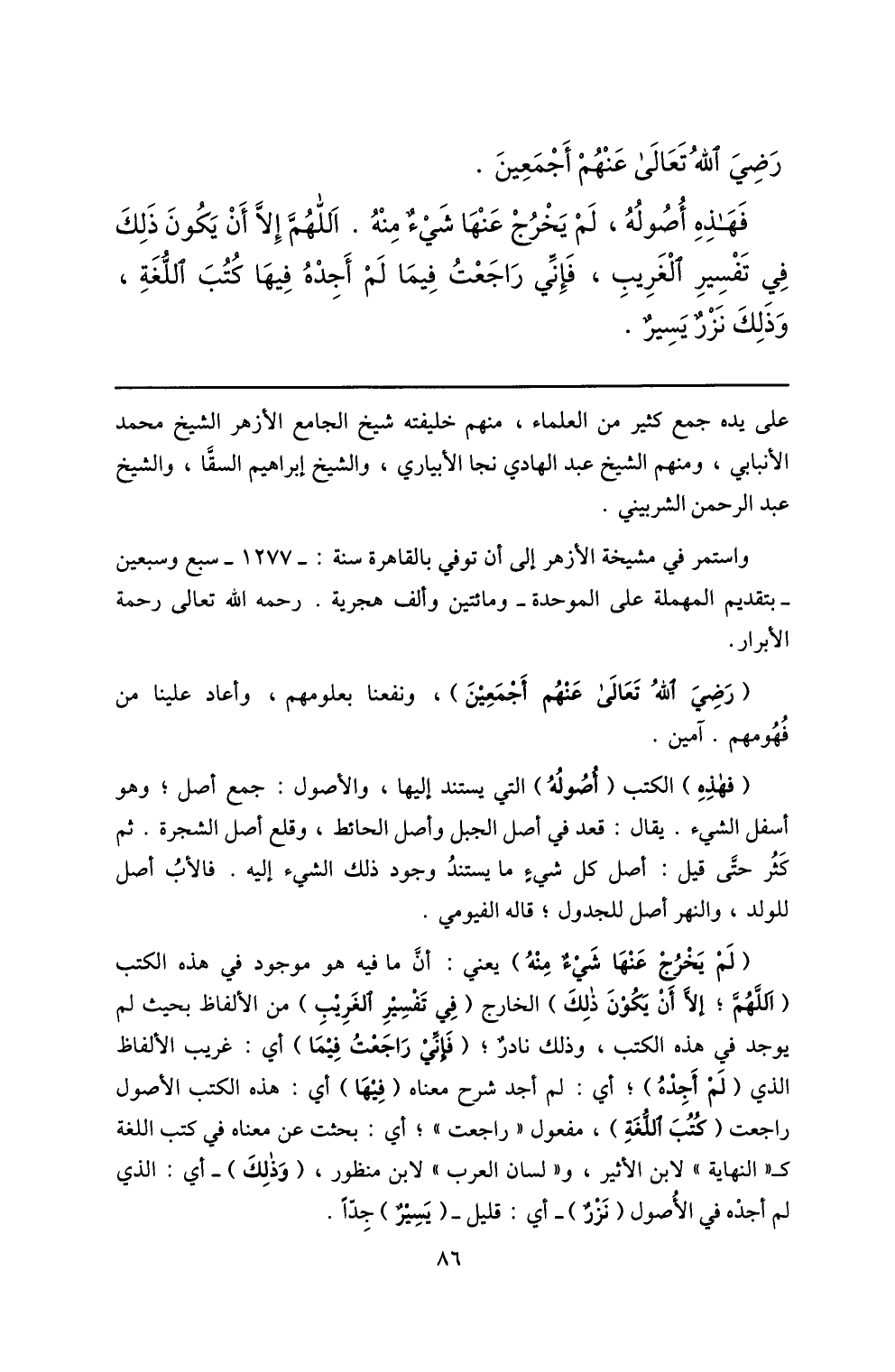 (لم يخرج عنها شيء منه) يعني: أنّ ما فيه هو موجود في هذه الكتب (اللهمّ؛ إلّا أن يكون ذلك) الخارج (في تفسير الغريب) من الألفاظ بحيث لم يوجد في هذه الكتب، وذلك نادر؛ (فإنّي راجعت فيما) أي: غريب الألفاظ الذي (لم أجده) ؛ أي: لم أجد شرح معناه (فيها) أي: هذه الكتب الأصول راجعت (كتب اللّغة) ، مفعول «راجعت» ؛ أي: بحثت عن معناه في كتب اللغة ك «النهاية» لابن الأثير، و «لسان العرب» لابن منظور، (وذلك) - أي: الذي لم أجده في الأصول (نزر) - أي: قليل- (يسير) جدّا.