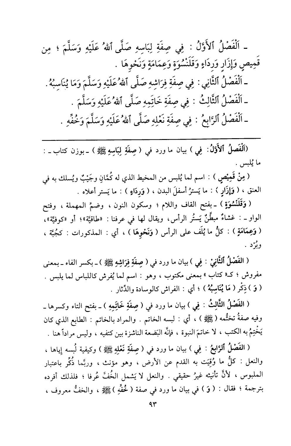 - الفصل الأوّل: في صفة لباسه صلّى الله عليه وسلّم؛ من قميص وإزار ورداء وقلنسوة وعمامة ونحوها.