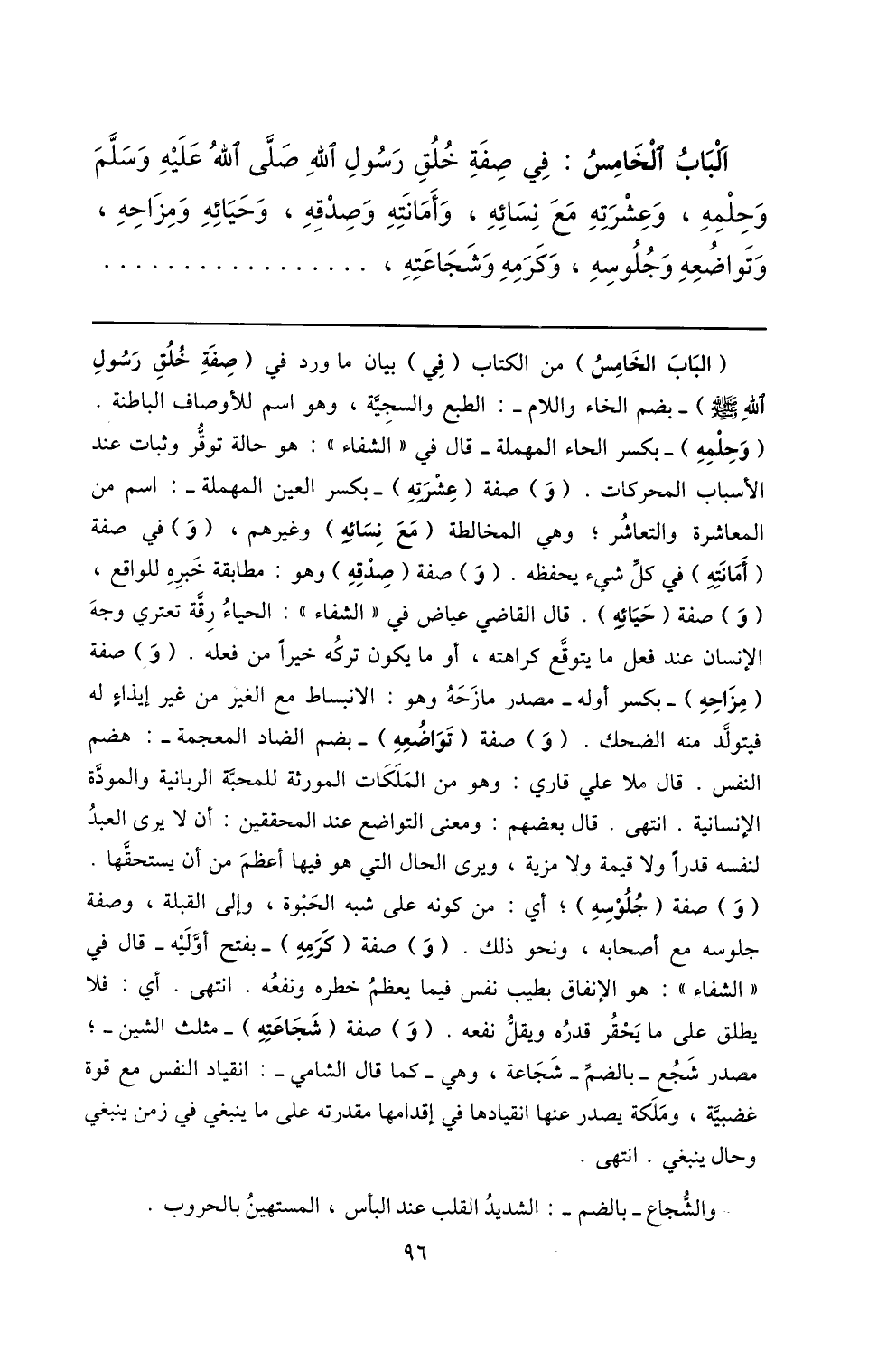 الباب الخامس: في صفة خلق رسول الله صلّى الله عليه وسلّم وحلمه، وعشرته مع نسائه، وأمانته وصدقه، وحيائه ومزاحه، وتواضعه وجلوسه، وكرمه وشجاعته، ...