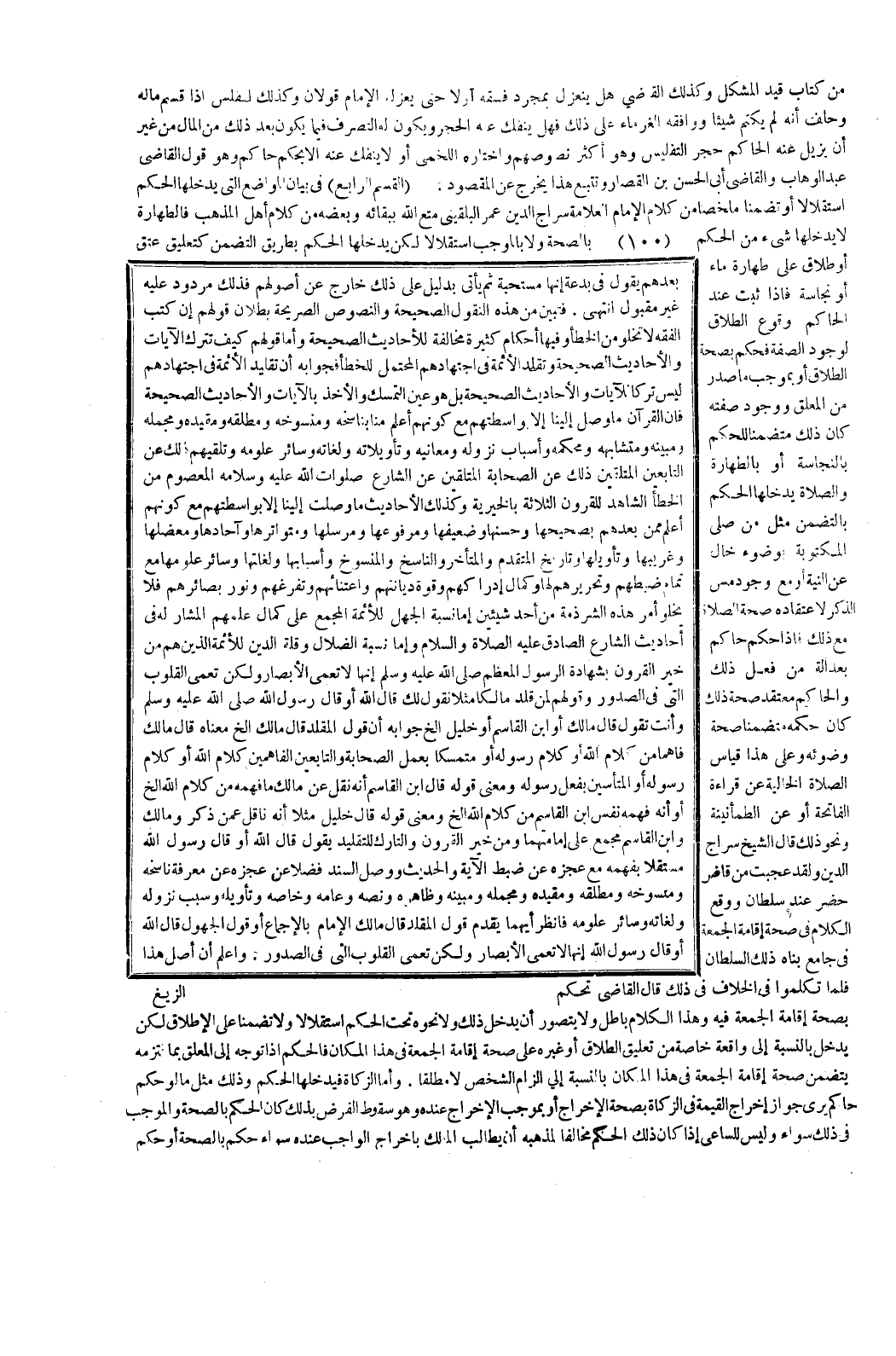 فَتَبَيَّنَ مِنْ هَذِهِ النُّقُولِ الصَّحِيحَةِ وَالنُّصُوصِ الصَّرِيحَةِ بُطْلَانُ قَوْلِهِمْ إنَّ كُتُبَ الْفِقْهِ لَا تَخْلُو مِنْ الْخَطَأِ وَفِيهَا أَحْكَامٌ كَثِيرَةٌ مُخَالِفَةٌ لِلْأَحَادِيثِ الصَّحِيحَةِ، وَأَمَّا قَوْلُهُمْ كَيْفَ تَتْرُكُ الْآيَاتِ وَالْأَحَادِيثَ الصَّحِيحَةَ وَتُقَلِّدُ الْأَئِمَّةَ فِي اجْتِهَادِهِمْ الْمُحْتَمِلِ لِلْخَطَأِ فَجَوَابُهُ أَنَّ تَقْلِيدَ الْأَئِمَّةِ فِي اجْتِهَادِهِمْ لَيْسَ تَرْكًا لِلْآيَاتِ وَالْأَحَادِيثِ الصَّحِيحَةِ بَلْ هُوَ عَيْنُ التَّمَسُّكِ وَالْأَخْذِ بِالْآيَاتِ وَالْأَحَادِيثِ الصَّحِيحَةِ فَإِنَّ الْقُرْآنَ مَا وَصَلَ إلَيْنَا إلَّا بِوَاسِطَتِهِمْ مَعَ كَوْنِهِمْ أَعْلَمَ مِنَّا بِنَاسِخِهِ وَمَنْسُوخِهِ وَمُطْلَقِهِ وَمُقَيَّدِهِ وَمُجْمَلِهِ وَمُبَيَّنِهِ وَمُتَشَابِهِهِ وَمُحْكَمِهِ وَأَسْبَابِ نُزُولِهِ وَمَعَانِيهِ وَتَأْوِيلَاتِهِ وَلُغَاتِهِ وَسَائِرِ عُلُومِهِ وَتَلَقِّيهِمْ ذَلِكَ عَنْ التَّابِعِينَ الْمُتَلَقِّينَ ذَلِكَ عَنْ الصَّحَابَةِ الْمُتَلَقِّينَ عَنْ الشَّارِعِ - صَلَوَاتُ اللَّهِ عَلَيْهِ وَسَلَامُهُ - الْمَعْصُومِ مِنْ الْخَطَأِ الشَّاهِدِ لِلْقُرُونِ الثَّلَاثَةِ بِالْخَيْرِيَّةِ.
