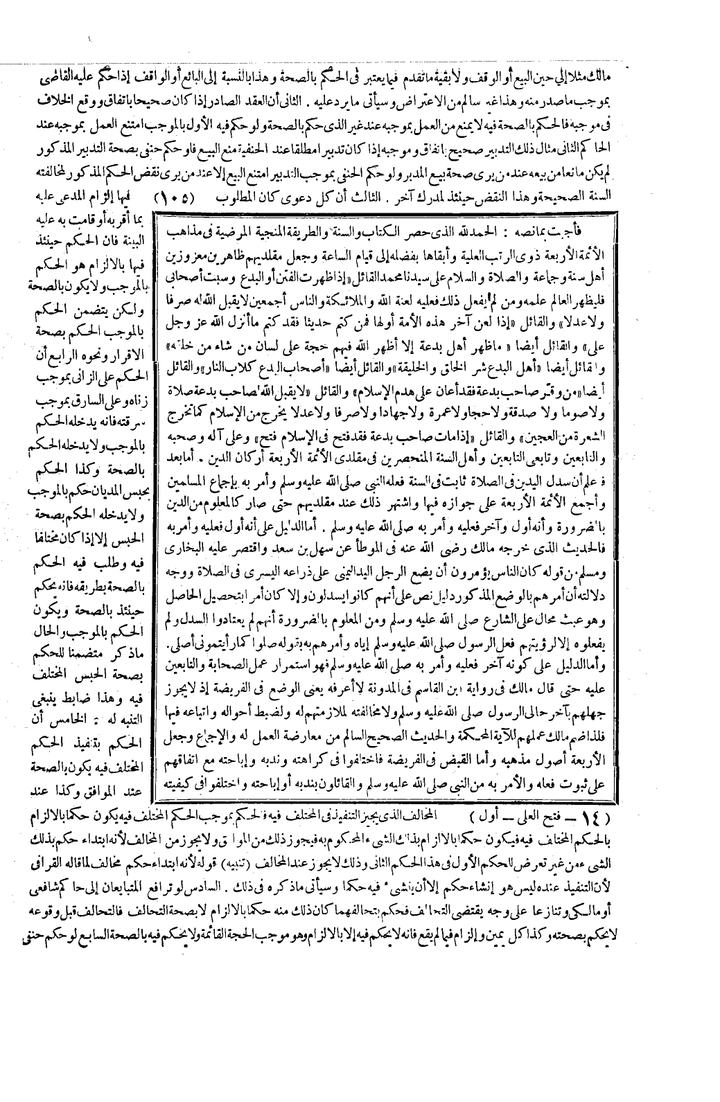 فَأَجَبْتُ بِمَا نَصُّهُ: الْحَمْدُ لِلَّهِ الَّذِي حَصَرَ الْكِتَابَ وَالسُّنَّةَ وَالطَّرِيقَةَ الْمُنْجِيَةَ الْمُرْضِيَةَ فِي مَذَاهِبِ الْأَئِمَّةِ الْأَرْبَعَةِ ذَوِي الرُّتَبِ الْعَلِيَّةِ وَأَبْقَاهَا بِفَضْلِهِ إلَى قِيَامِ السَّاعَةِ وَجَعَلَ مُقَلِّدِيهِمْ ظَاهِرِينَ مَعْزُوزِينَ أَهْلَ سُنَّةٍ وَجَمَاعَةٍ، وَالصَّلَاةُ وَالسَّلَامُ عَلَى سَيِّدِنَا مُحَمَّدٍ الْقَائِلِ «إذَا ظَهَرَتْ الْفِتَنُ أَوْ الْبِدَعُ وَسُبَّتْ أَصْحَابِي فَلْيُظْهِرْ الْعَالِمُ عِلْمَهُ وَمَنْ لَمْ يَفْعَلْ ذَلِكَ فَعَلَيْهِ لَعْنَةُ اللَّهِ وَالْمَلَائِكَةِ وَالنَّاسِ أَجْمَعِينَ لَا يَقْبَلُ اللَّهُ لَهُ صَرْفًا وَلَا عَدْلًا» .