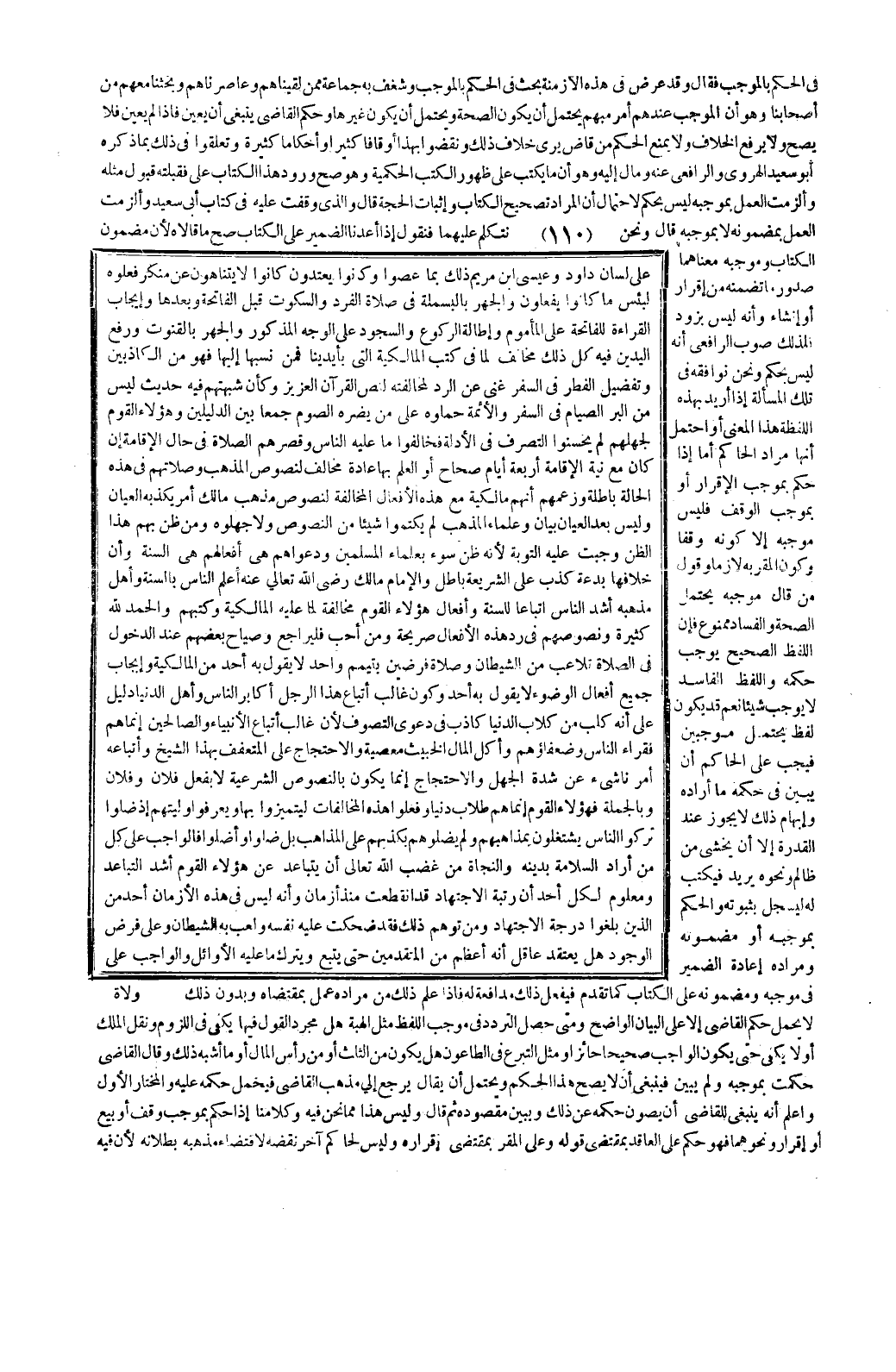 {لُعِنَ الَّذِينَ كَفَرُوا مِنْ بَنِي إِسْرَائِيلَ عَلَى لِسَانِ دَاوُدَ وَعِيسَى ابْنِ مَرْيَمَ ذَلِكَ بِمَا عَصَوْا وَكَانُوا يَعْتَدُونَ} [المائدة: 78] {كَانُوا لا يَتَنَاهَوْنَ عَنْ مُنْكَرٍ فَعَلُوهُ لَبِئْسَ مَا كَانُوا يَفْعَلُونَ} [المائدة: 79] وَالْجَهْرُ بِالْبَسْمَلَةِ فِي صَلَاةِ الْفَرْضِ وَالسُّكُوتُ قَبْلَ الْفَاتِحَةِ وَبَعْدَهَا وَإِيجَابُ الْقِرَاءَةِ لِلْفَاتِحَةِ عَلَى الْمَأْمُومِ وَإِطَالَةُ الرُّكُوعِ وَالسُّجُودِ عَلَى الْوَجْهِ الْمَذْكُورِ وَالْجَهْرُ بِالْقُنُوتِ وَرَفْعُ الْيَدَيْنِ فِيهِ كُلُّ ذَلِكَ مُخَالِفٌ لِمَا فِي كُتُبِ الْمَالِكِيَّةِ الَّتِي بِأَيْدِينَا فَمَنْ نَسَبَهَا إلَيْهَا فَهُوَ مِنْ الْكَاذِبِينَ وَتَفْضِيلُ الْفِطْرِ فِي السَّفَرِ غَنِيٌّ عَنْ الرَّدِّ لِمُخَالَفَتِهِ لِنَصِّ الْقُرْآنِ الْعَزِيزِ وَكَأَنَّ شُبْهَتَهُمْ فِيهِ حَدِيثُ «لَيْسَ مِنْ الْبِرِّ الصِّيَامُ فِي السَّفَرِ» وَالْأَئِمَّةُ حَمَلُوهُ عَلَى مَنْ يَضُرُّهُ الصَّوْمُ جَمْعًا بَيْنَ الدَّلِيلَيْنِ وَهَؤُلَاءِ الْقَوْمُ لِجَهْلِهِمْ لَمْ يُحْسِنُوا التَّصَرُّفَ فِي الْأَدِلَّةِ فَخَالَفُوا مَا عَلَيْهِ النَّاسُ وَقَصْرُهُمْ الصَّلَاةَ فِي حَالِ الْإِقَامَةِ إنْ كَانَ مَعَ نِيَّةِ الْإِقَامَةِ أَرْبَعَةَ أَيَّامٍ صِحَاحٍ أَوْ الْعِلْمُ بِهَا عَادَةً مُخَالِفٌ لِنُصُوصِ الْمَذْهَبِ وَصَلَاتُهُمْ فِي هَذِهِ الْحَالَةِ بَاطِلَةٌ وَزَعْمُهُمْ أَنَّهُمْ مَالِكِيَّةٌ مَعَ هَذِهِ الْأَفْعَالِ الْمُخَالِفَةِ لِنُصُوصِ مَذْهَبِ مَالِكٍ أَمْرٌ يُكَذِّبُهُ الْعِيَانُ وَلَيْسَ بَعْدَ الْعِيَانِ بَيَانٌ وَعُلَمَاءُ الْمَذْهَبِ لَمْ يَكْتُمُوا شَيْئًا مِنْ النُّصُوصِ وَلَا جَهِلُوهُ وَمَنْ ظَنَّ بِهِمْ هَذَا الظَّنَّ وَجَبَتْ عَلَيْهِ التَّوْبَةُ لِأَنَّهُ ظَنُّ سُوءٍ بِعُلَمَاءِ الْمُسْلِمِينَ وَدَعْوَاهُمْ هِيَ أَنَّ أَفْعَالَهُمْ هِيَ السُّنَّةُ وَأَنَّ خِلَافَهَا بِدْعَةٌ كَذِبٌ عَلَى الشَّرِيعَةِ بَاطِلٌ وَالْإِمَامُ مَالِكٌ - رَضِيَ اللَّهُ تَعَالَى عَنْهُ - أَعْلَمُ النَّاسِ بِالسُّنَّةِ وَأَهْلُ مَذْهَبِهِ أَشَدُّ النَّاسِ اتِّبَاعًا لِلسُّنَّةِ، وَأَفْعَالُ هَؤُلَاءِ الْقَوْمِ مُخَالِفَةٌ لِمَا عَلَيْهِ الْمَالِكِيَّةُ وَكُتُبُهُمْ وَالْحَمْدُ لِلَّهِ كَثِيرَةٌ وَنُصُوصُهُمْ فِي رَدِّ هَذِهِ الْأَفْعَالِ صَرِيحَةٌ وَمَنْ أَحَبَّ فَلْيُرَاجِعْ