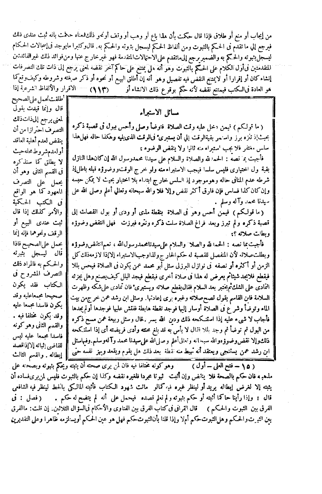 فَأَجَبْت بِمَا نَصُّهُ: الْحَمْدُ لِلَّهِ وَالصَّلَاةُ وَالسَّلَامُ عَلَى سَيِّدِنَا مُحَمَّدٍ رَسُولِ اللَّهِ إنْ كَانَ هَذَا النَّازِلُ بَقِيَّةَ بَوْلٍ اخْتِيَارِيٍّ فَلَيْسَ سَلَسًا فَيَجِبُ الِاسْتِبْرَاءُ مِنْهُ وَلَوْ خَرَجَ الْوَقْتُ وَوُضُوءُهُ قَبْلَهُ بَاطِلٌ إذْ شَرْطُهُ عَدَمُ الْمُنَافِي وَهُوَ مَوْجُودٌ إذْ السَّلَسُ خَارِجٌ ابْتِدَاءً بِلَا اخْتِيَارٍ بِحَيْثُ لَا يُمْكِنُ حَبْسُهُ وَإِنْ كَانَ كَذَا فَسَلَسٌ فَإِنْ فَارَقَ أَكْثَرَ نَقَضَ وَإِلَّا فَلَا، وَاَللَّهُ سُبْحَانَهُ وَتَعَالَى أَعْلَمُ، وَصَلَّى اللَّهُ عَلَى سَيِّدِنَا مُحَمَّدٍ وَآلِهِ وَسَلَّمَ.