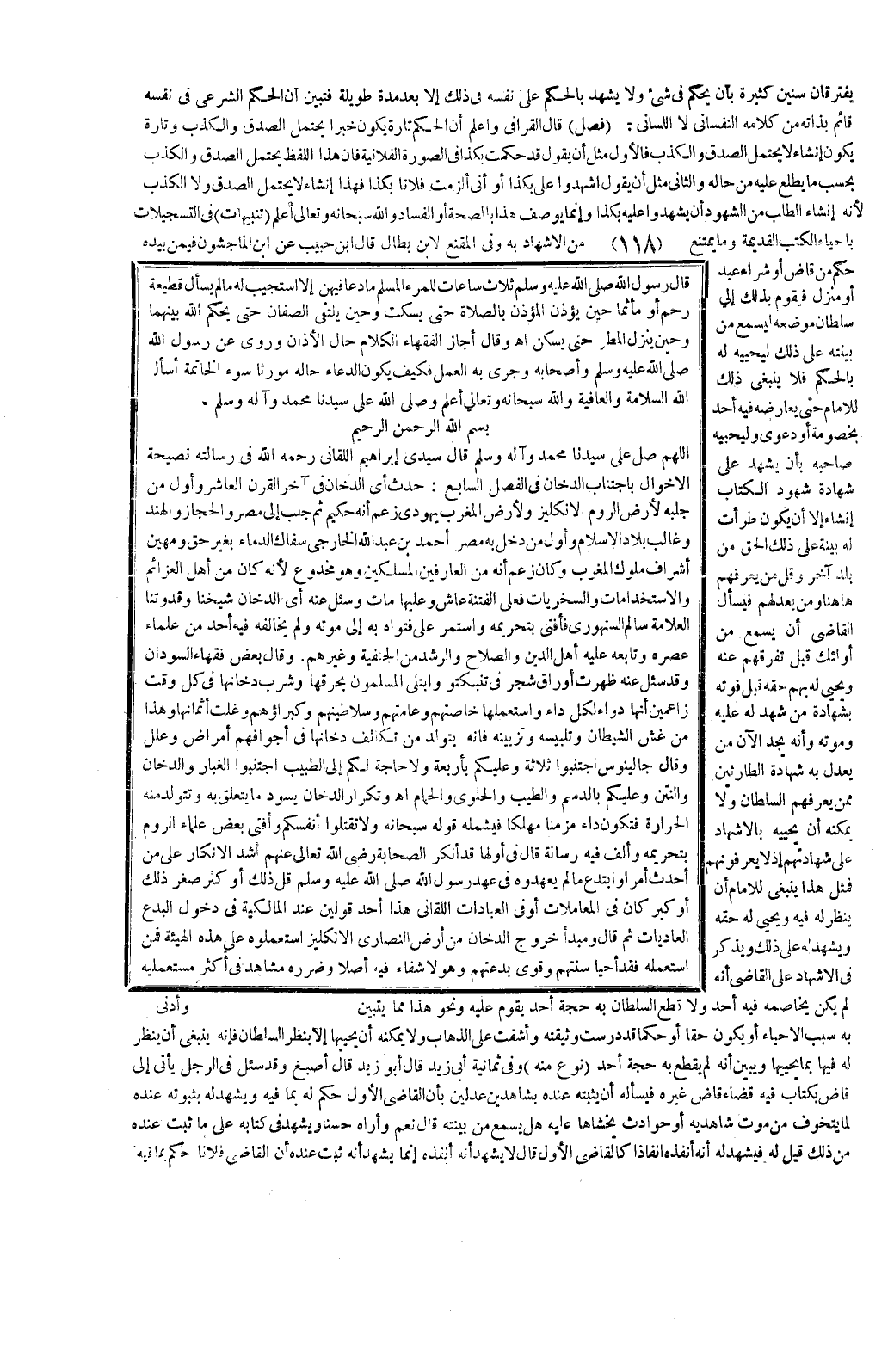 بِسْمِ اللَّهِ الرَّحْمَنِ الرَّحِيمِ اللَّهُمَّ صَلِّ عَلَى سَيِّدِنَا مُحَمَّدٍ وَآلِهِ وَسَلِّمْ قَالَ سَيِّدِي إبْرَاهِيمُ اللَّقَانِيُّ - رَحِمَهُ اللَّهُ - فِي رِسَالَتِهِ نَصِيحَةُ الْأَخْوَالِ بِاجْتِنَابِ الدُّخَانِ فِي الْفَصْلِ السَّابِعِ: حَدَثَ أَيْ الدُّخَانُ فِي آخِرِ الْقَرْنِ الْعَاشِرِ وَأَوَّلُ مَنْ جَلَبَهُ لِأَرْضِ الرُّومِ الْإِنْكِلِيزُ وَلِأَرْضِ الْمَغْرِبِ يَهُودِيٌّ زَعَمَ أَنَّهُ حَكِيمٌ ثُمَّ جُلِبَ إلَى مِصْرَ وَالْحِجَازِ وَالْهِنْدِ وَغَالِبِ بِلَادِ الْإِسْلَامِ وَأَوَّلُ مَنْ دَخَلَ بِهِ مِصْرَ أَحْمَدُ بْنُ عَبْدِ اللَّهِ الْخَارِجِيُّ سَفَّاكُ الدِّمَاءِ بِغَيْرِ حَقٍّ وَمُهِينُ أَشْرَافِ مُلُوكِ الْمَغْرِبِ وَكَانَ زَعَمَ أَنَّهُ مِنْ الْعَارِفِينَ الْمُسْلَكِينَ وَهُوَ مَخْدُوعٌ لِأَنَّهُ كَانَ مِنْ أَهْلِ الْعَزَائِمِ وَالِاسْتِخْدَامَات وَالسُّخْرِيَاتِ فَعَلَى الْفِتْنَةِ عَاشَ وَعَلَيْهَا مَاتَ وَسُئِلَ عَنْهُ أَيْ الدُّخَانُ شَيْخُنَا وَقُدْوَتُنَا الْعَلَّامَةُ سَالِمٌ السَّنْهُورِيُّ فَأَفْتَى بِتَحْرِيمِهِ وَاسْتَمَرَّ عَلَى فَتْوَاهُ بِهِ إلَى مَوْتِهِ وَلَمْ يُخَالِفْهُ فِيهِ أَحَدٌ مِنْ عُلَمَاءِ عَصْرِهِ وَتَابَعَهُ عَلَيْهِ أَهْلُ الدِّينِ وَالصَّلَاحِ وَالرُّشْدِ مِنْ الْحَنَفِيَّةِ وَغَيْرِهِمْ.