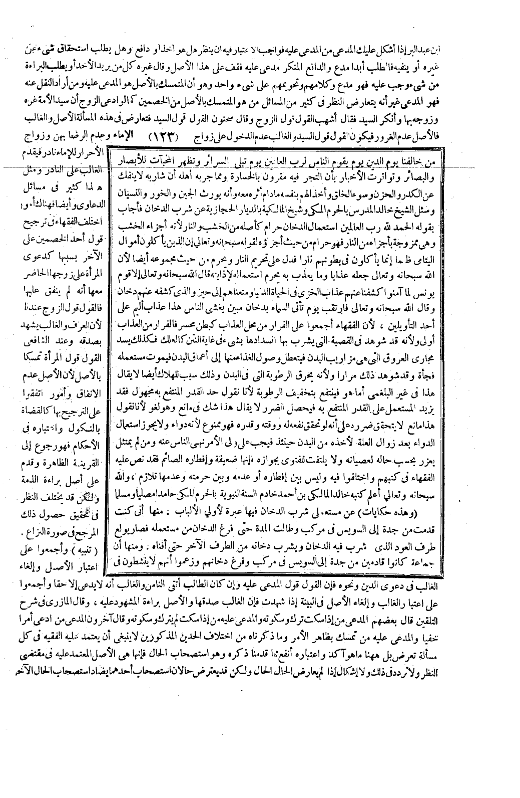 وَاَلَّذِي كَشَفَهُ عَنْهُمْ دُخَانٌ وَقَالَ اللَّهُ - سُبْحَانَهُ وَتَعَالَى - {فَارْتَقِبْ يَوْمَ تَأْتِي السَّمَاءُ بِدُخَانٍ مُبِينٍ - يَغْشَى النَّاسَ هَذَا عَذَابٌ أَلِيمٌ} [الدخان: 10 - 11] عَلَى أَحَدِ التَّأْوِيلَيْنِ، لِأَنَّ الْفُقَهَاءَ أَجْمَعُوا عَلَى الْفِرَارِ مِنْ مَحَلِّ الْعَذَابِ كَبَطْنِ مُحَسِّرٍ فَالْفِرَارُ مِنْ الْعَذَابِ أَوْلَى وَلِأَنَّهُ قَدْ شُوهِدَ فِي الْقَصَبَةِ الَّتِي يُشْرَبُ بِهَا انْسِدَادُهَا بِشَيْءٍ فِي غَايَةِ النَّتْنِ كَالْعِلْكِ فَكَذَلِكَ يَسُدُّ مَجَارِيَ الْعُرُوقِ الَّتِي هِيَ مَزَارِيبُ الْبَدَنِ فَيَتَعَطَّلُ وُصُولُ الْغِذَاءِ مِنْهَا إلَى أَعْمَاقِ الْبَدَنِ فَيَمُوتُ مُسْتَعْمِلُهُ فَجْأَةً وَقَدْ شُوهِدَ ذَلِكَ مِرَارًا وَلِأَنَّهُ يَحْرُقُ الرُّطُوبَةَ الَّتِي فِي الْبَدَنِ وَذَلِكَ سَبَبٌ لِلْهَلَاكِ أَيْضًا لَا يُقَالُ هَذَا فِي غَيْرِ الْبَلْغَمِيِّ أَمَّا هُوَ فَيَنْتَفِعُ بِتَخْفِيفِ الرُّطُوبَةِ لِأَنَّا نَقُولُ حَدُّ الْقَدْرِ الْمُنْتَفَعُ بِهِ مَجْهُولٌ فَقَدْ يَزِيدُ الْمُسْتَعْمِلُ عَلَى الْقَدْرِ الْمُنْتَفَعِ بِهِ فَيَحْصُلُ الضَّرَرُ لَا يُقَالُ هَذَا شَكٌّ فِي مَانِعٍ وَهُوَ لَغْوٌ لِأَنَّا نَقُولُ هَذَا مَانِعٌ لَا يَتَحَقَّقُ ضَرَرُهُ عَلَى أَنَّهُ لَوْ تَحَقَّقَ نَفْعُهُ لَهُ وَوَقْتُهُ وَقَدْرُهُ، فَهُوَ مَمْنُوعٌ؛ لِأَنَّهُ دَوَاءٌ وَلَا يَجُوزُ اسْتِعْمَالُ الدَّوَاءِ بَعْدَ زَوَالِ الْعِلَّةِ لِأَخْذِهِ مِنْ الْبَدَنِ حِينَئِذٍ فَيَجِبُ عَلَى وَلِيِّ الْأَمْرِ نَهْيُ النَّاسِ عَنْهُ وَمَنْ لَمْ يَمْتَثِلْ يُعَزَّرُ بِحَسَبِ حَالِهِ لِعِصْيَانِهِ وَلَا يُلْتَفَتُ لِلْفَتْوَى بِجَوَازِهِ فَإِنَّهَا ضَعِيفَةٌ وَإِفْطَارُهُ الصَّائِمَ فَقَدْ نَصَّ عَلَيْهِ الْفُقَهَاءُ فِي كُتُبِهِمْ وَاخْتَلَفُوا فِيهِ وَلَيْسَ بَيْنَ إفْطَارِهِ أَوْ عَدَمِهِ وَبَيْنَ حُرْمَتِهِ وَعَدَمِهَا تَلَازُمٌ، وَاَللَّهُ - سُبْحَانَهُ وَتَعَالَى - أَعْلَمُ كَتَبَهُ خَالِدٌ الْمَالِكِيُّ بْنُ أَحْمَدَ خَادِمُ السُّنَّةِ النَّبَوِيَّةِ بِالْحَرَمِ الْمَكِّيِّ حَامِدًا مُصَلِّيًا وَمُسْلِمًا.
