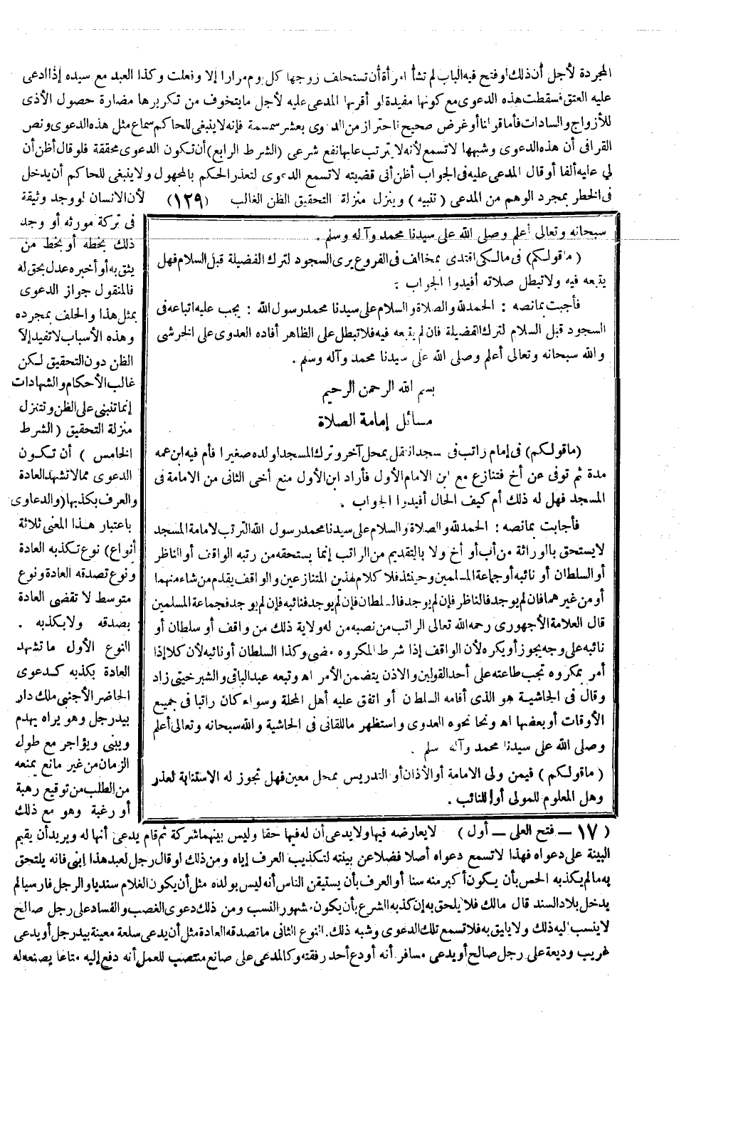 بِسْمِ اللَّهِ الرَّحْمَنِ الرَّحِيمِ مَسَائِلُ إمَامَةِ الصَّلَاةِ (مَا قَوْلُكُمْ) فِي إمَامٍ رَاتِبٍ فِي مَسْجِدٍ انْتَقَلَ بِمَحَلٍّ آخَرَ وَتَرَكَ الْمَسْجِدَ لِوَلَدِهِ صَغِيرًا فَأَمَّ فِيهِ ابْنُ عَمِّهِ مُدَّةً ثُمَّ تُوُفِّيَ عَنْ أَخٍ فَتَنَازَعَ مَعَ ابْنِ الْإِمَامِ الْأَوَّلِ فَأَرَادَ ابْنُ الْأَوَّلِ مَنْعَ أَخِي الثَّانِي مِنْ الْإِمَامَةِ فِي الْمَسْجِدِ فَهَلْ لَهُ ذَلِكَ أَمْ كَيْفَ الْحَالُ أَفِيدُوا الْجَوَابَ.