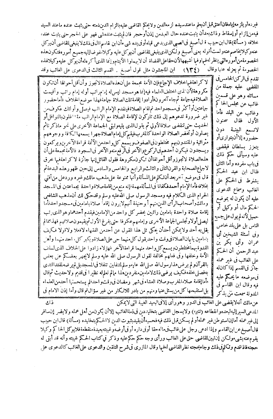 ثُمَّ قَالَ فِي مَوْضِعٍ آخَرَ بَعْدَ أَنْ تَكَلَّمَ عَلَى الْمَسْأَلَةِ وَأَنَّهَا مَمْنُوعَةٌ عَلَى مَذْهَبِ مَالِكٍ وَغَيْرِهِ وَرَدَّ عَلَى مَنْ أَفْتَى بِخِلَافِهِ فَأَمَّا الْإِمَامُ أَحْمَدُ فَكَفَانَا فِي الْمَسْأَلَةِ مُهِمَّةً فَإِنَّهُ مَنَعَ مِنْ إقَامَةِ صَلَاةٍ وَاحِدَةٍ بِجَمَاعَتَيْنِ فِي الْمَسْجِدِ الْحَرَامِ الَّذِي الْكَلَامُ فِيهِ وَمَسْجِدِ الرَّسُولِ - صَلَّى اللَّهُ عَلَيْهِ وَسَلَّمَ - وَقَدْ حَكَى لَك أَنَّ مَذْهَبَ الشَّافِعِيِّ وَمَالِكٍ وَأَصْحَابِ الرَّأْيِ الَّذِينَ مِنْهُمْ أَبُو حَنِيفَةَ أَنَّهُمْ لَا يَرَوْنَ إقَامَةَ صَلَاةٍ بِإِمَامَيْنِ فِي مَسْجِدٍ وَاحِدٍ فَأَمَّا إقَامَةُ صَلَاةٍ وَاحِدَةٍ بِإِمَامَيْنِ رَاتِبَيْنِ يَحْضُرُ كُلُّ وَاحِدٍ مِنْ الْإِمَامَيْنِ فَيُقَدَّمُ أَحَدُهُمَا وَهُوَ الَّذِي رُتِّبَ لِيُصَلِّيَ أَوَّلًا وَتَجْلِسُ الْجَمَاعَةُ الْأُخْرَى وَإِمَامُهُمْ عُكُوفًا حَتَّى يَفْرُغَ الْأَوَّلُ ثُمَّ يُقِيمُونَ صَلَاتَهُمْ فَهَذَا مِمَّا لَمْ يَقُلْ بِهِ أَحَدٌ وَلَا يُمْكِنُ أَحَدٌ أَنْ يَحْكِيَ مِثْلَ هَذَا الْقَوْلِ عَنْ أَحَدٍ مِنْ الْفُقَهَاءِ لَا فِعْلًا وَلَا قَوْلًا فَكَيْفَ بِإِمَامَيْنِ يُقِيمَانِ الصَّلَاةَ فِي وَقْتٍ وَاحِدٍ يَقُولُ كُلٌّ مِنْهُمَا حَيَّ عَلَى الصَّلَاةِ وَيُكَبِّرُ كُلُّ وَاحِدٍ مِنْهُمَا، وَأَهْلُ الْقُدْوَةِ بِهِمَا مُخْتَلَطُونَ، وَيَسْمَعُ كُلُّ وَاحِدٍ مِنْهُمَا قِرَاءَةَ الْآخَرِ فَهَؤُلَاءِ زَادُوا عَلَى الْخِلَافِ الَّذِي لِسَلَفِ الْأُمَّةِ وَخَلَفِهَا، وَفِي فِعْلِهِمْ مُخَالَفَةٌ لِقَوْلِ الرَّسُولِ - صَلَّى اللَّهُ عَلَيْهِ وَسَلَّمَ - «لَا يَجْهَرُ بَعْضُكُمْ عَلَى بَعْضٍ بِالْقُرْآنِ» وَلَمْ يَرْضَ هَذَا رَسُولُ اللَّهِ - صَلَّى اللَّهُ عَلَيْهِ وَسَلَّمَ - لِمُتَنَفِّلَيْنِ تَنَفَّلَا فِي الْمَسْجِدِ بَلْ لَمْ يَرْضَهُ لِمُقْتَدٍ اقْتَدَى بِهِ فَصَلَّى خَلْفَهُ فَكَيْفَ يَرْضَى ذَلِكَ لِإِمَامَيْنِ مُنْفَرِدَيْنِ هَذَا مِمَّا لَمْ نَعْلَمْ لَهُ نَظِيرًا فِي قَدِيمٍ وَلَا حَدِيثٍ.
