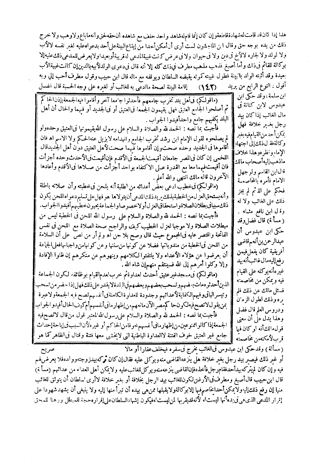 فَأَجَبْت بِمَا نَصُّهُ: الْحَمْدُ لِلَّهِ وَالصَّلَاةُ وَالسَّلَامُ عَلَى رَسُولِ اللَّهِ الْمُعْتَبَرُ قَوْلُ مَنْ قَالَ لَا تَصِحُّ فِيهِ الْجُمُعَةُ إذَا كَانُوا مَمْنُوعِينَ مِنْ إظْهَارِ مَا فِي أَنْفُسِهِمْ خَوْفًا مِنْ الْحَاكِمِ أَوْ غَيْرِهِ لِأَنَّ السَّبَبَ فِي إبَاحَةِ إحْدَاثِ جَامِعٍ غَيْرِ الْعَتِيقِ خَوْفُ الْفِتْنَةِ لَا الْعَدَاوَةُ الْبَاطِنِيَّةُ الَّتِي لَا يُخْشَى مَعَهَا فِتْنَةٌ وَقِتَالٌ فِي الظَّاهِرِ كَمَا هُوَ