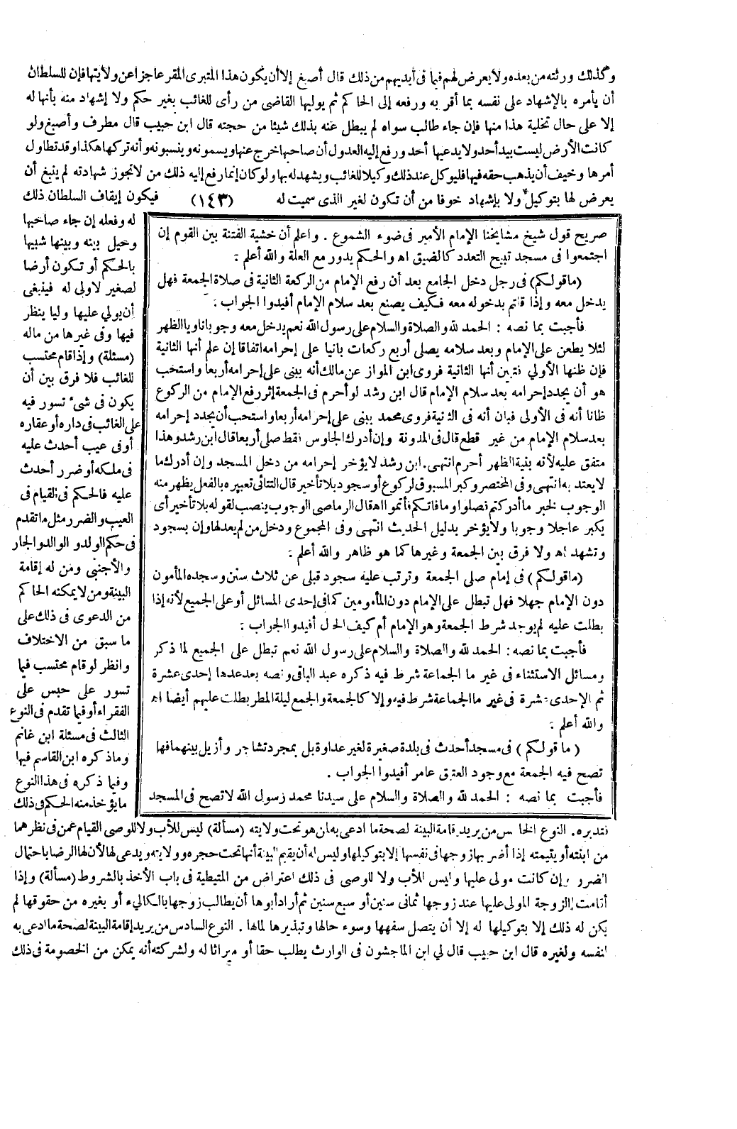 فَأَجَبْت بِمَا نَصُّهُ: الْحَمْدُ لِلَّهِ وَالصَّلَاةُ وَالسَّلَامُ عَلَى رَسُولِ اللَّهِ نَعَمْ تَبْطُلُ عَلَى الْجَمِيعِ لِمَا ذُكِرَ وَمَسَائِلُ الِاسْتِثْنَاءِ فِي غَيْرِ مَا الْجَمَاعَةُ شَرْطٌ فِيهِ ذَكَرَهُ عَبْدُ الْبَاقِي وَنَصُّهُ بَعْدَ عَدِّهَا إحْدَى عَشَرَةَ ثُمَّ الْإِحْدَى عَشَرَةَ فِي غَيْرِ مَا الْجَمَاعَةُ شَرْطٌ فِيهِ وَإِلَّا كَالْجُمُعَةِ وَالْجَمْعِ لَيْلَةَ الْمَطَرِ بَطَلَتْ عَلَيْهِمْ أَيْضًا اهـ وَاَللَّهُ أَعْلَمُ.