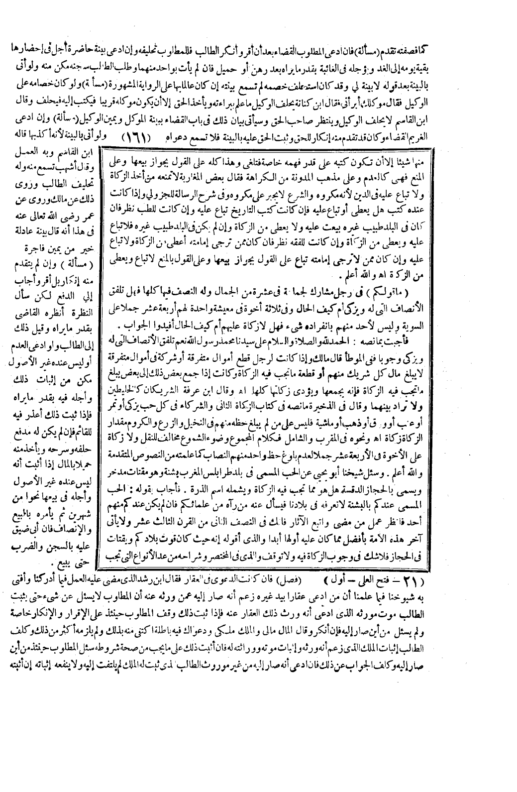وَفِي شَرْحِ الرِّسَالَةِ لِلْجُزُولِيِّ، وَإِذَا كَانَتْ عِنْدَهُ كُتُبٌ هَلْ يُعْطَى أَوْ تُبَاعُ عَلَيْهِ فَإِنْ كَانَتْ كُتُبُ التَّارِيخِ تُبَاعُ عَلَيْهِ، وَإِنْ كَانَتْ لِلطِّبِّ نُظِرَ فَإِنْ كَانَ فِي الْبَلَدِ طَبِيبٌ غَيْرُهُ بِيعَتْ عَلَيْهِ، وَلَا يُعْطَى مِنْ الزَّكَاةِ، وَإِنْ لَمْ يَكُنْ فِي الْبَلَدِ طَبِيبٌ غَيْرُهُ فَلَا تُبَاعُ عَلَيْهِ، وَيُعْطَى مِنْ الزَّكَاةِ، وَإِنْ كَانَتْ لِلْفِقْهِ نُظِرَ فَإِنْ كَانَ مِمَّنْ تُرْجَى إمَامَتُهُ أُعْطِيَ مِنْ الزَّكَاةِ، وَلَا تُبَاعُ عَلَيْهِ، وَإِنْ كَانَ مِمَّنْ لَا تُرْجَى إمَامَتُهُ تُبَاعُ عَلَى الْقَوْلِ بِجَوَازِ بَيْعِهَا، وَعَلَى الْقَوْلِ بِالْمَنْعِ لَا تُبَاع، وَيُعْطَى مِنْ الزَّكَاةِ اهـ، وَاَللَّهُ أَعْلَمُ.