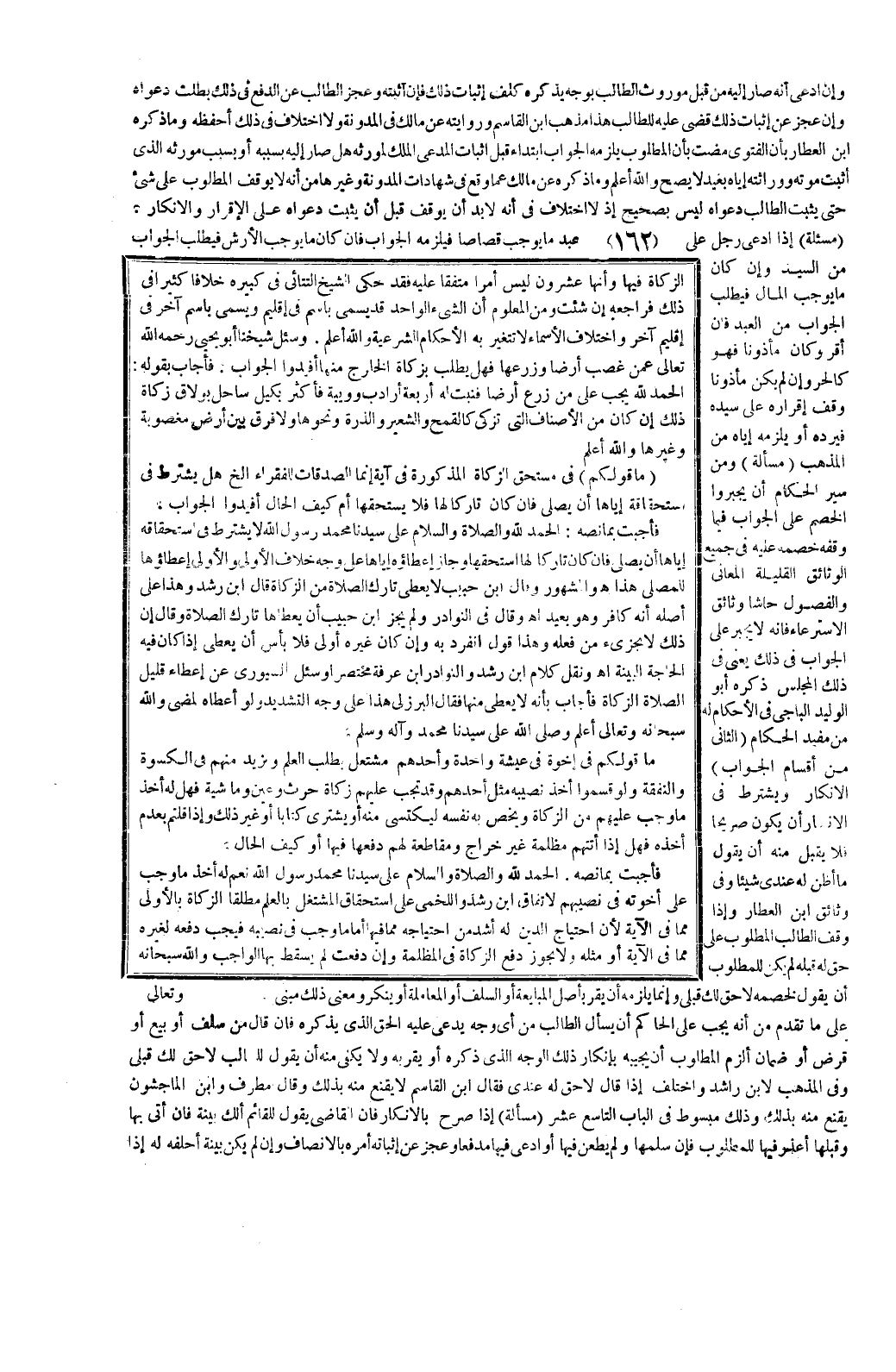 فَأَجَبْت بِمَا نَصُّهُ: الْحَمْدُ لِلَّهِ، وَالصَّلَاةُ، وَالسَّلَامُ عَلَى سَيِّدِنَا مُحَمَّدٍ رَسُولِ اللَّهِ نَعَمْ لَهُ أَخْذُ مَا وَجَبَ عَلَى إخْوَتِهِ فِي نَصِيبِهِمْ لِاتِّفَاقِ ابْنِ رُشْدٍ وَاللَّخْمِيِّ عَلَى اسْتِحْقَاقِ الْمُشْتَغِلِ بِالْعِلْمِ مُطْلَقًا الزَّكَاةَ بِالْأَوْلَى مِمَّا فِي الْآيَةِ؛ لِأَنَّ احْتِيَاجَ الدِّينِ لَهُ أَشَدُّ مِنْ احْتِيَاجِهِ مِمَّا فِيهَا أَمَّا مَا وَجَبَ فِي نَصِيبِهِ فَيَجِبُ دَفْعُهُ لِغَيْرِهِ مِمَّا فِي الْآيَةِ أَوْ مِثْلِهِ، وَلَا يَجُوزُ دَفْعُ الزَّكَاةِ فِي الْمَظْلِمَةِ، وَإِنْ دُفِعَتْ لَمْ يَسْقُطْ بِهَا الْوَاجِبُ، وَاَللَّهُ سُبْحَانَهُ